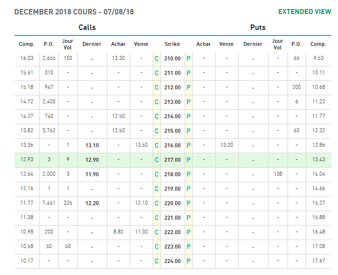 en option le gros des positions ouvertes est sur 220 en dec18.