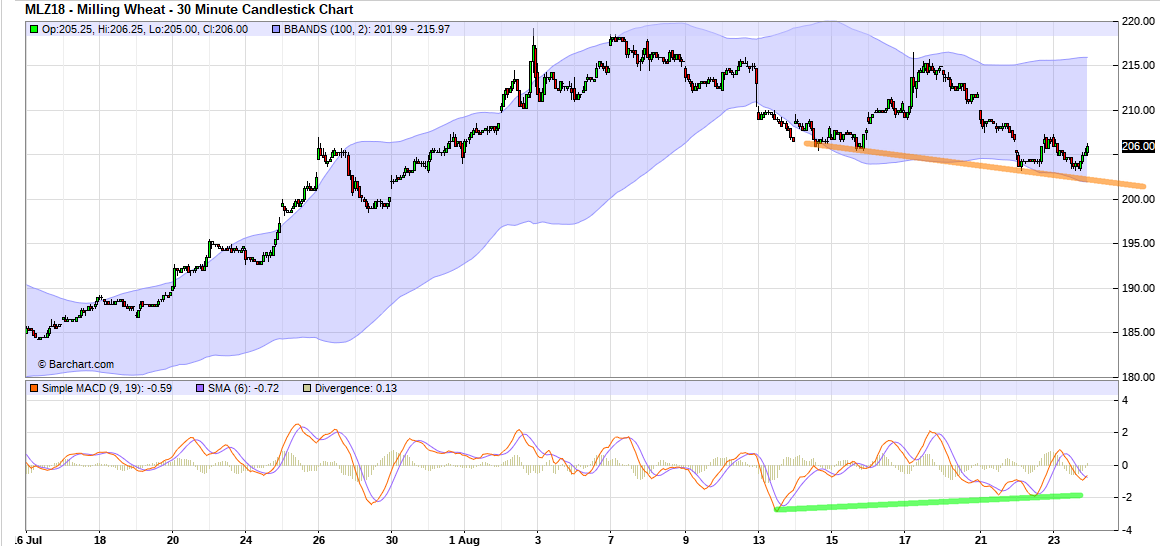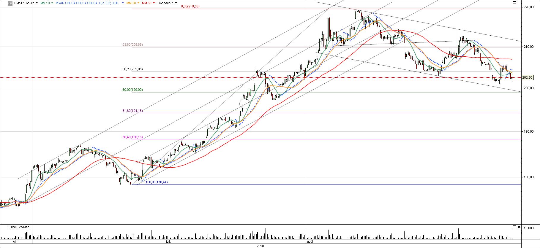 Ceci étant dit, nous avions une hausse facile à suivre qui s’est mis en place depuis le 11/07 tu prends par exemple le dec18 en 1h, tu vois que tu as un canal haussier. Celui ci a été cassé à la baisse le 9/08.