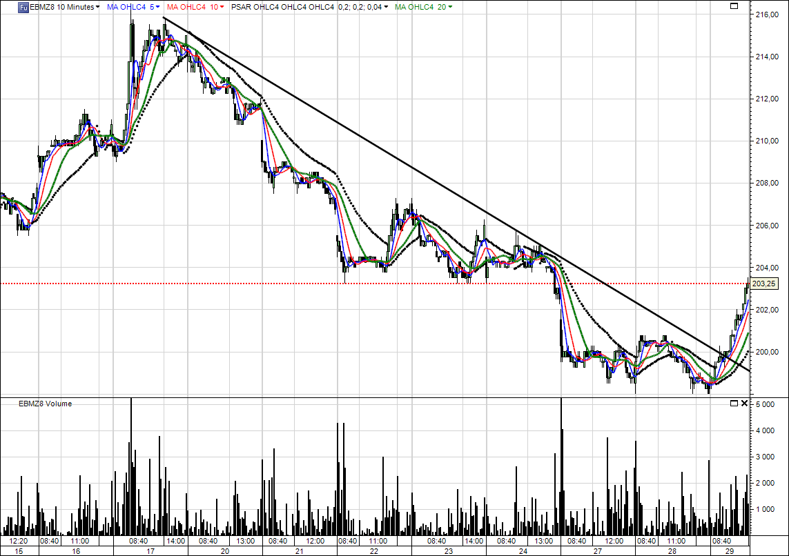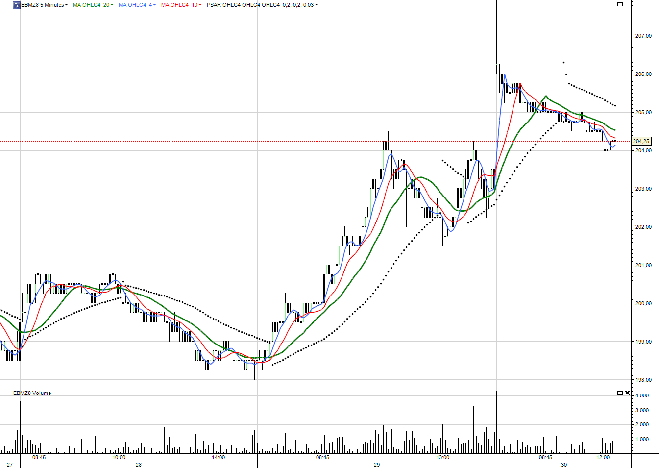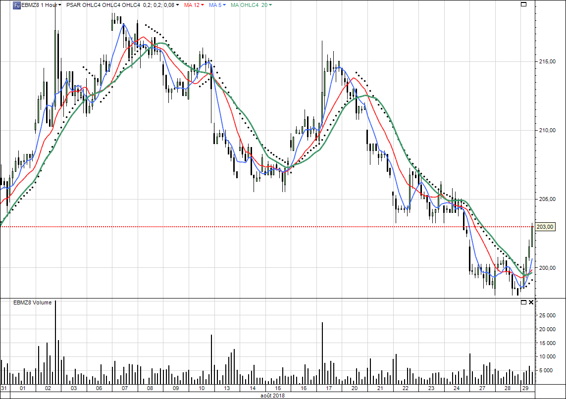 notre blé décembre en 5 mn; gap d’ouverture à 204.50 fermé; et maintenant on attend 15h30, que les marchés US ouvrent en séance de jour. parabolic repassera haussier au-dessus de 205.25 (pour l’instant) en moyenne OHLC/4. Mais ça c’est du TCT car sur 5mn, en 10mn c’est 206.00 et en 1 heure on est toujours haussier à 202.50 mais en daily, on est encore baissier à 205.50, mon parabolic étant à la veille de basculer.