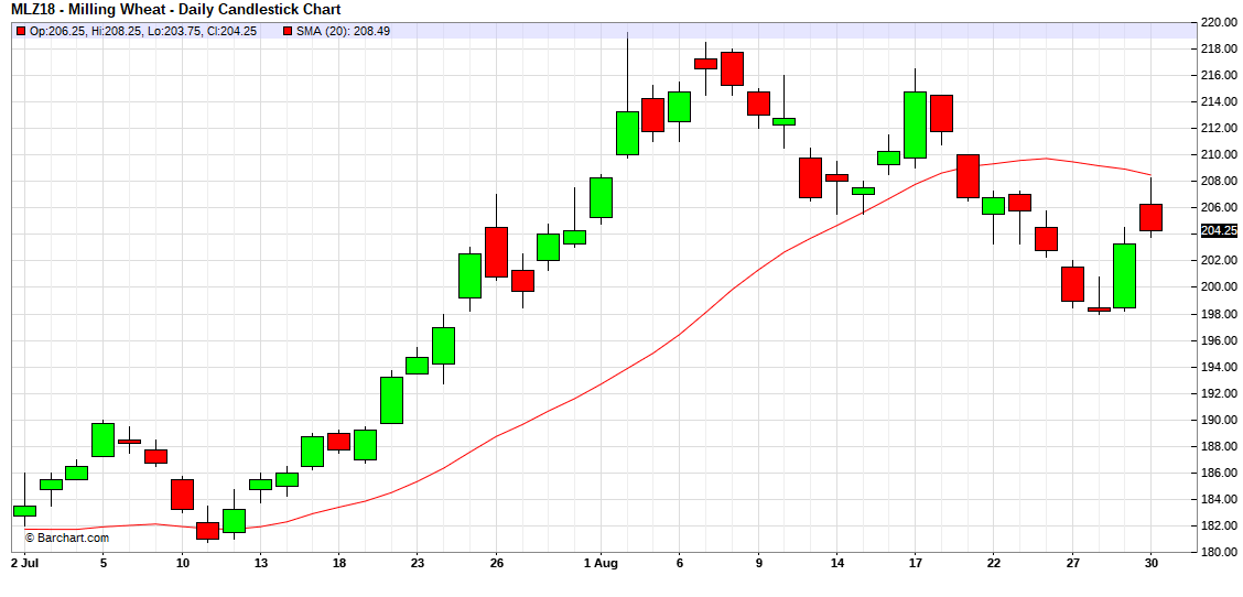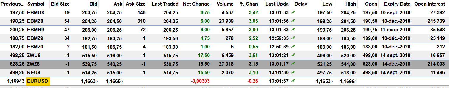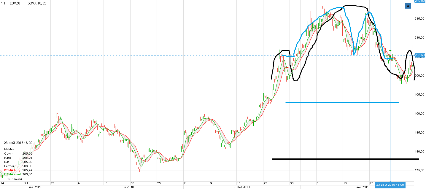 Sur le blé déc, l’objectf baissier de la tasse est autour de 194€, cela ferait une correction sur le fameux 61.8%.