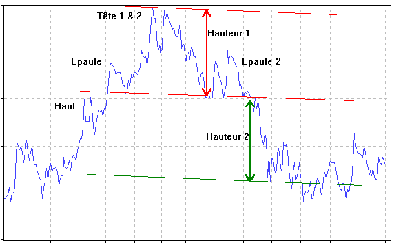 En fait c’est exactement cela avec le double top dans la tête. Du coup j’en ai profité pour regarder les volumes, ceux ci sont bien au maxi dans la tête dans la phase haussiere, mais c’est moins évident pour les épaules. Les pointes de volumes sont justes avant la pointe de chaque épaule…Pour le moment les volumes de l’épaule droite sont inférieurs à ceux de la gauche.