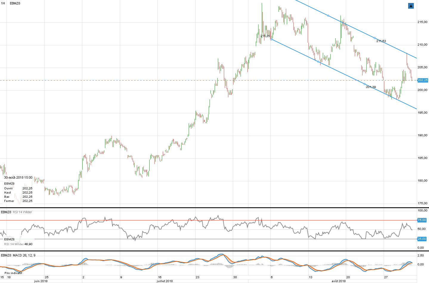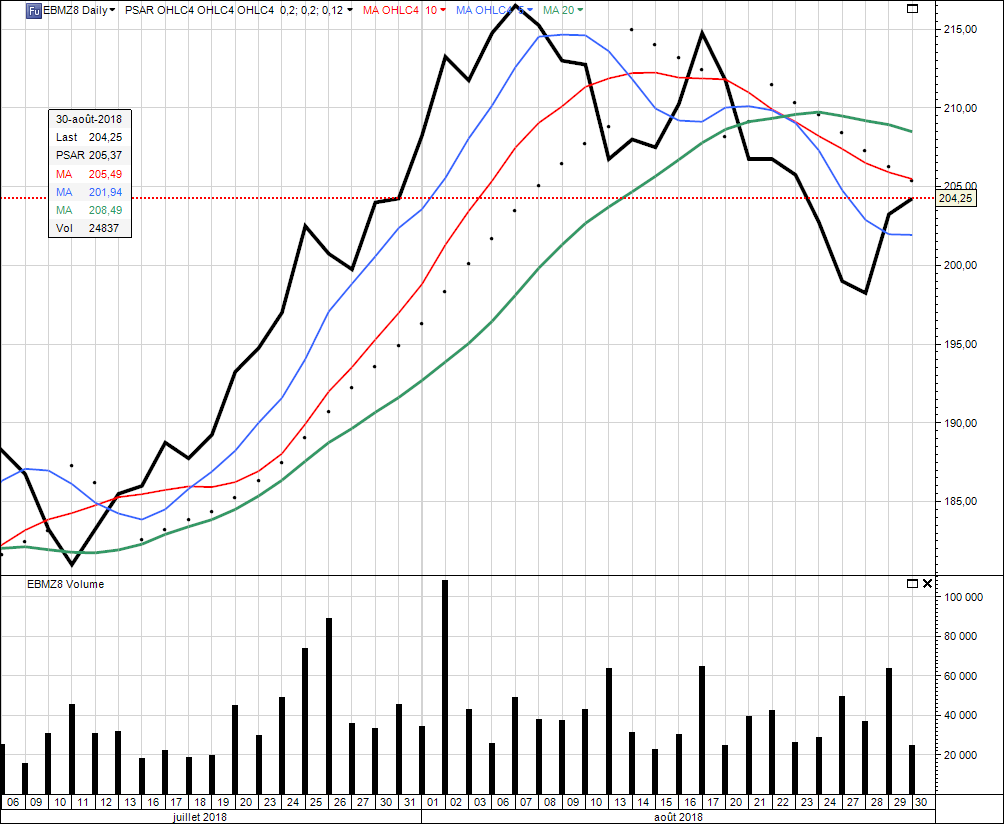 Tu as quelques éléments techniques, mais c’est surtout la vision d’ensemble sur le support, et la situation blé + wheat : les 2 sont en limite, sur un support, un point décisif, donc si là pour un nouveau test sur la semaine autour de 200 et 530 les acheteurs ne se manifestent pas et ne saisissent pas l’opportunité du support, ça veut dire que c’est mort pour un rebond à court terme.