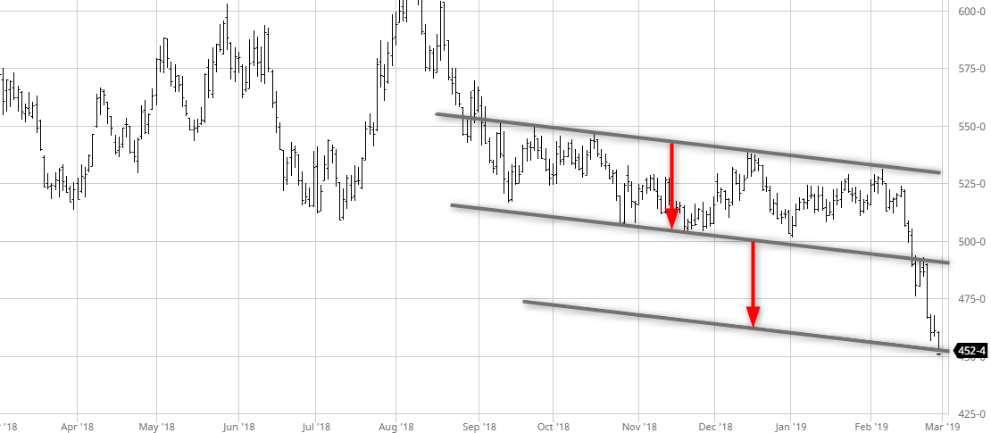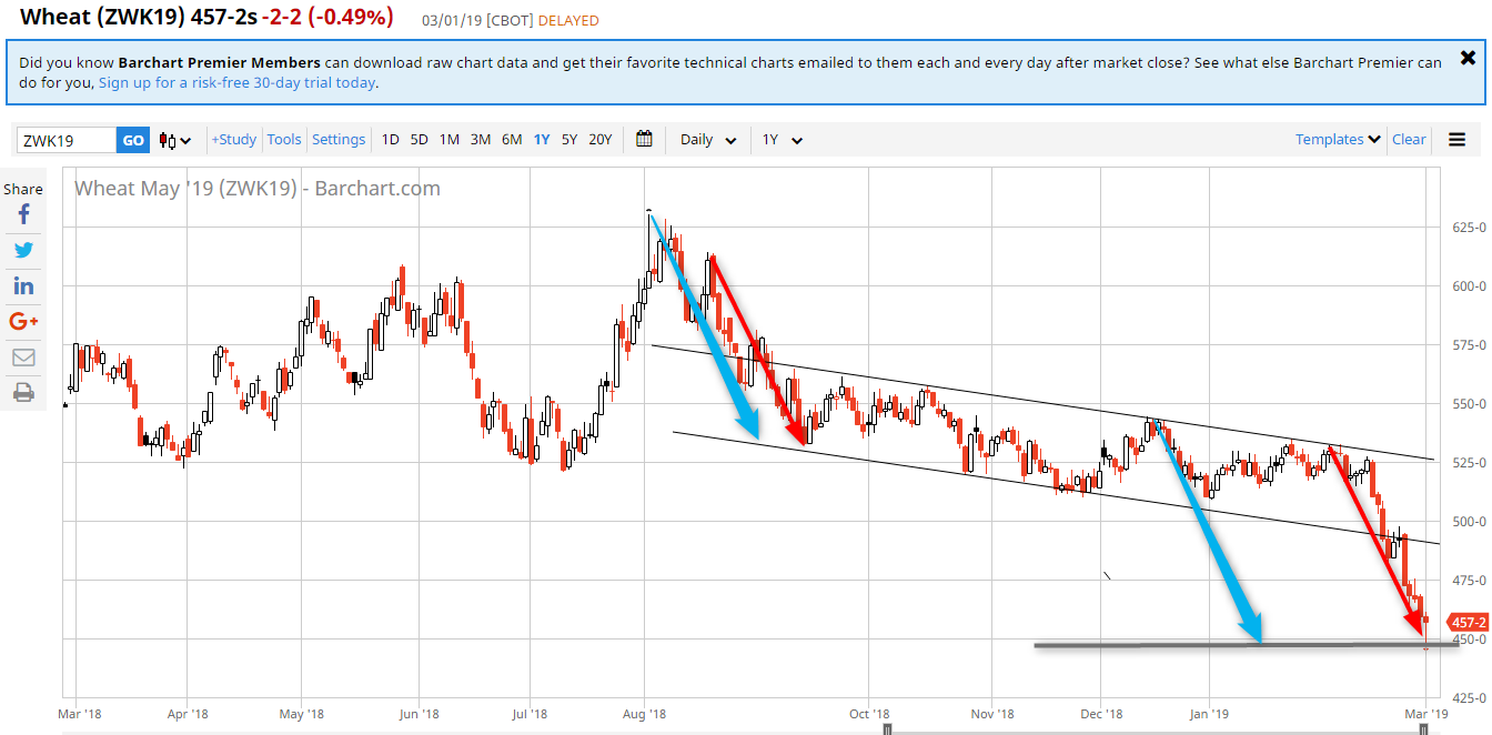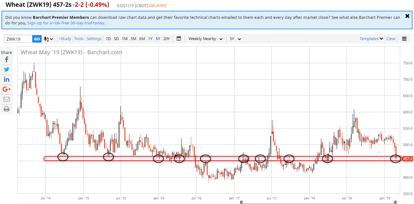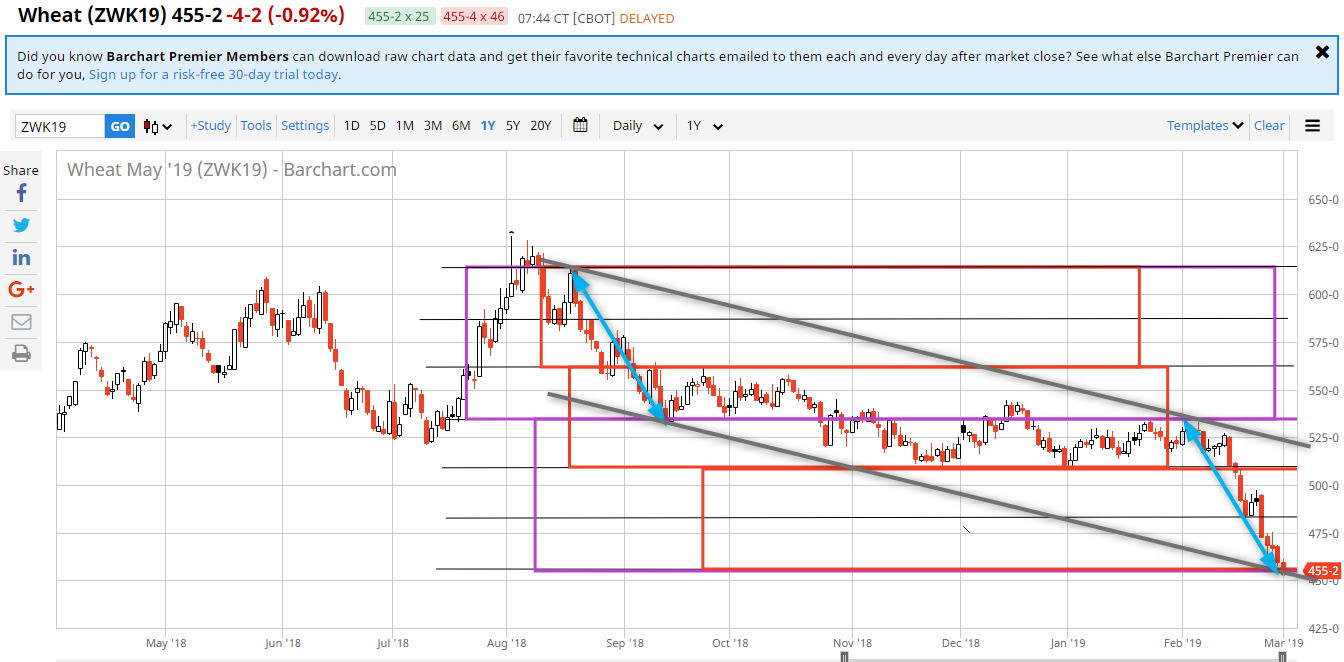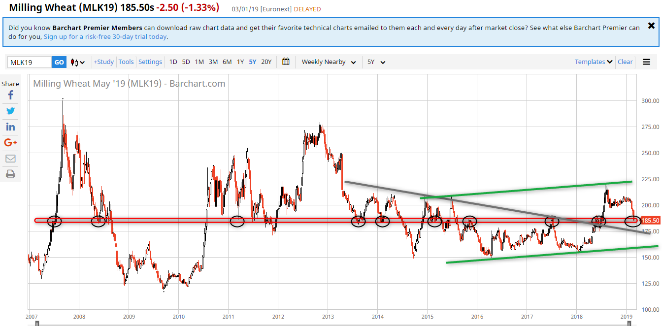 Blé Wheat Mai 19, on est sur les derniers supports intéressants pour relancer la machine, supports historiques, retracement 61.8% en blé, en dessous faudra laisser filer et patienter…