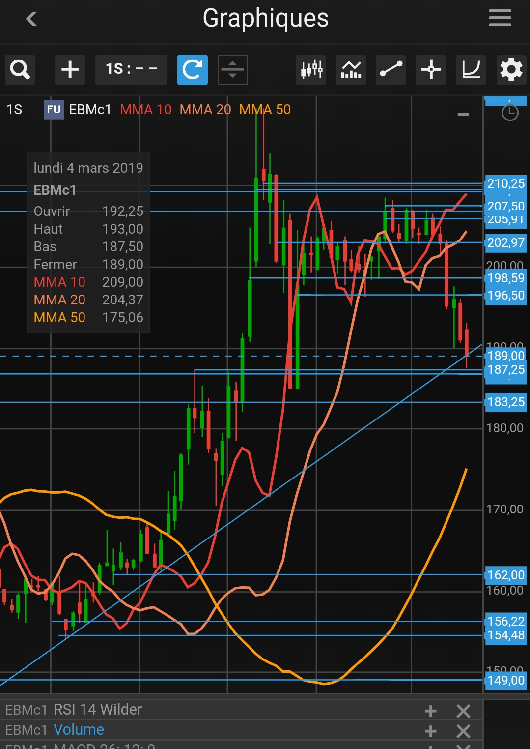 Pour moi, puisque 1- on n’a pas franchi de résistance depuis 207-208 et 2- les supports indiqués ont cassé, je répète qu’on est baissier jusqu’à nouvel ordre = jusqu’à prise d’appui sur support.