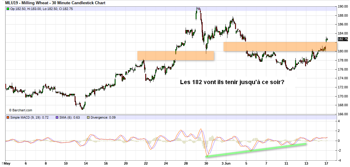 J’ai l’impression que les cours du blé Euronext n’arrive plus a suivre les cours du wheat et du corn .Nos bougie sont toujours dans l’hésitation à croire que quelques informations de l’est pourraient tout faire basculer dans le rouge.