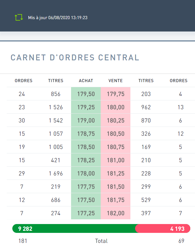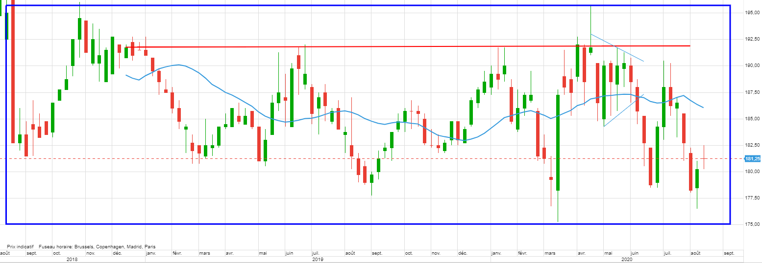 Le marché continue de valider le cadre moyen terme, le rebond et les achats indiqués, on rebondit déjà de 10 € pour toucher 187 en séance.