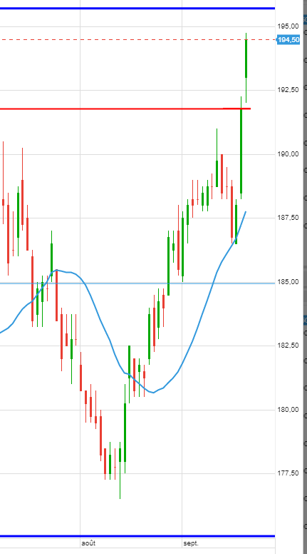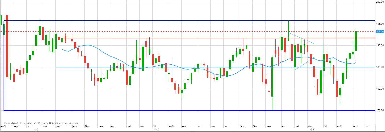 L’appui est bon, on revient sur 190 et le haut du range moyen terme soit toujours 190-195 cf. cadre bleu.