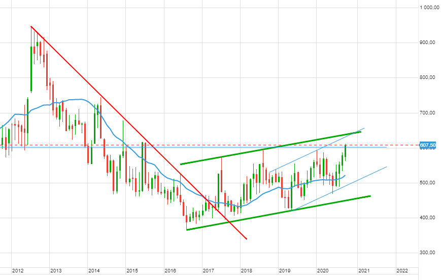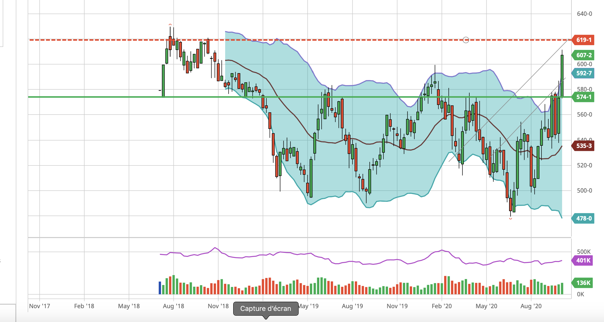 Tendance haussière mais succession de résistances dans la zone actuelle, environ tous les 20 depuis 580.
