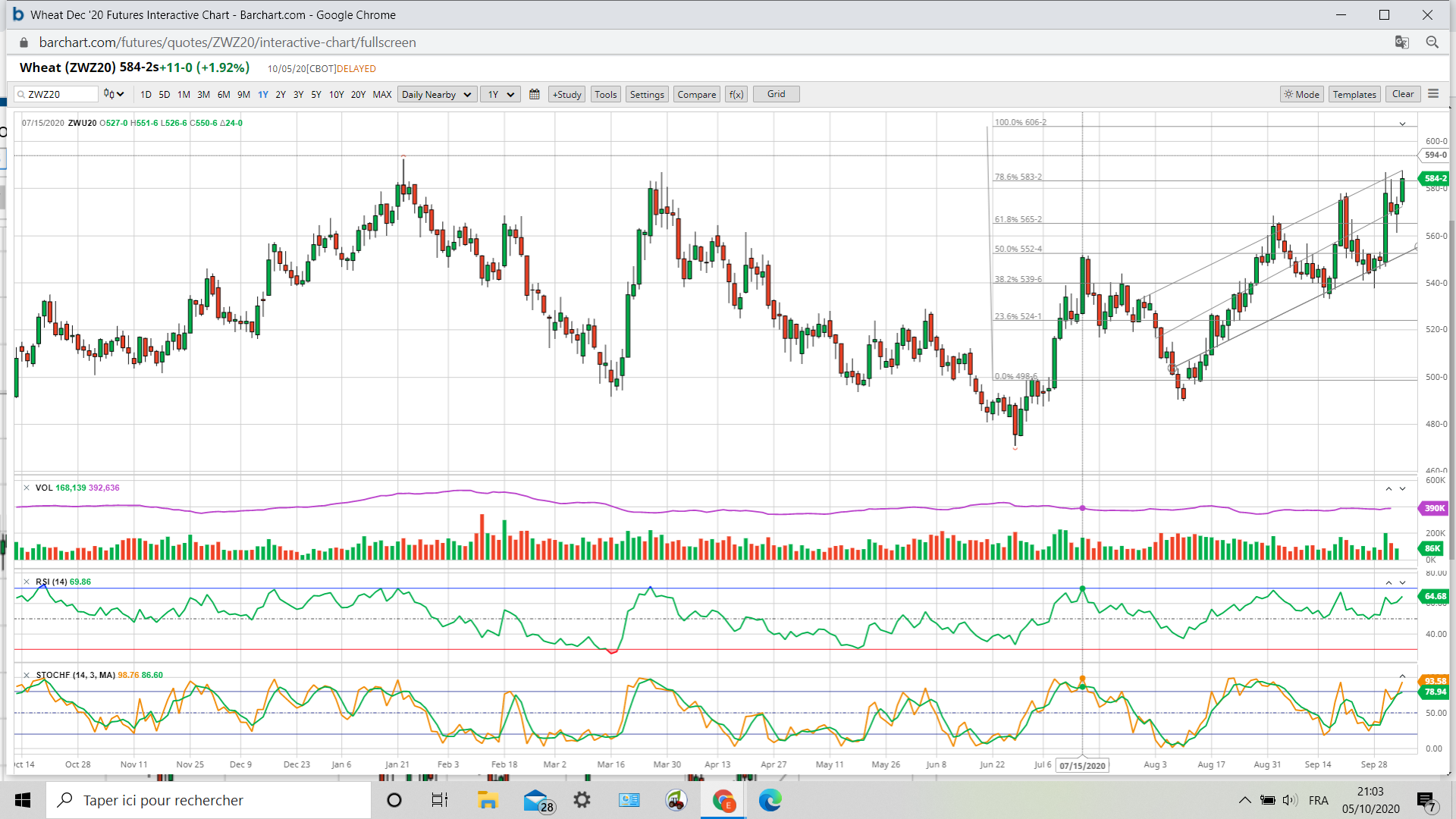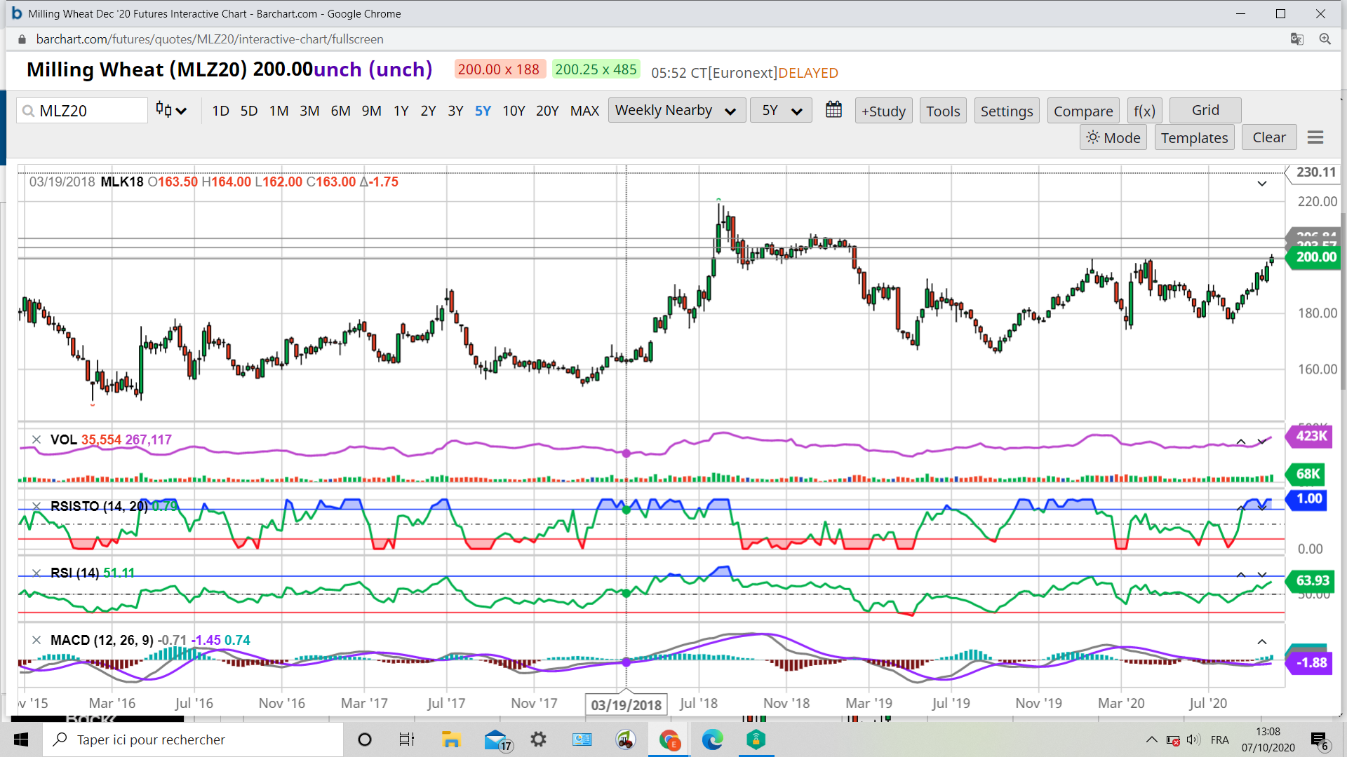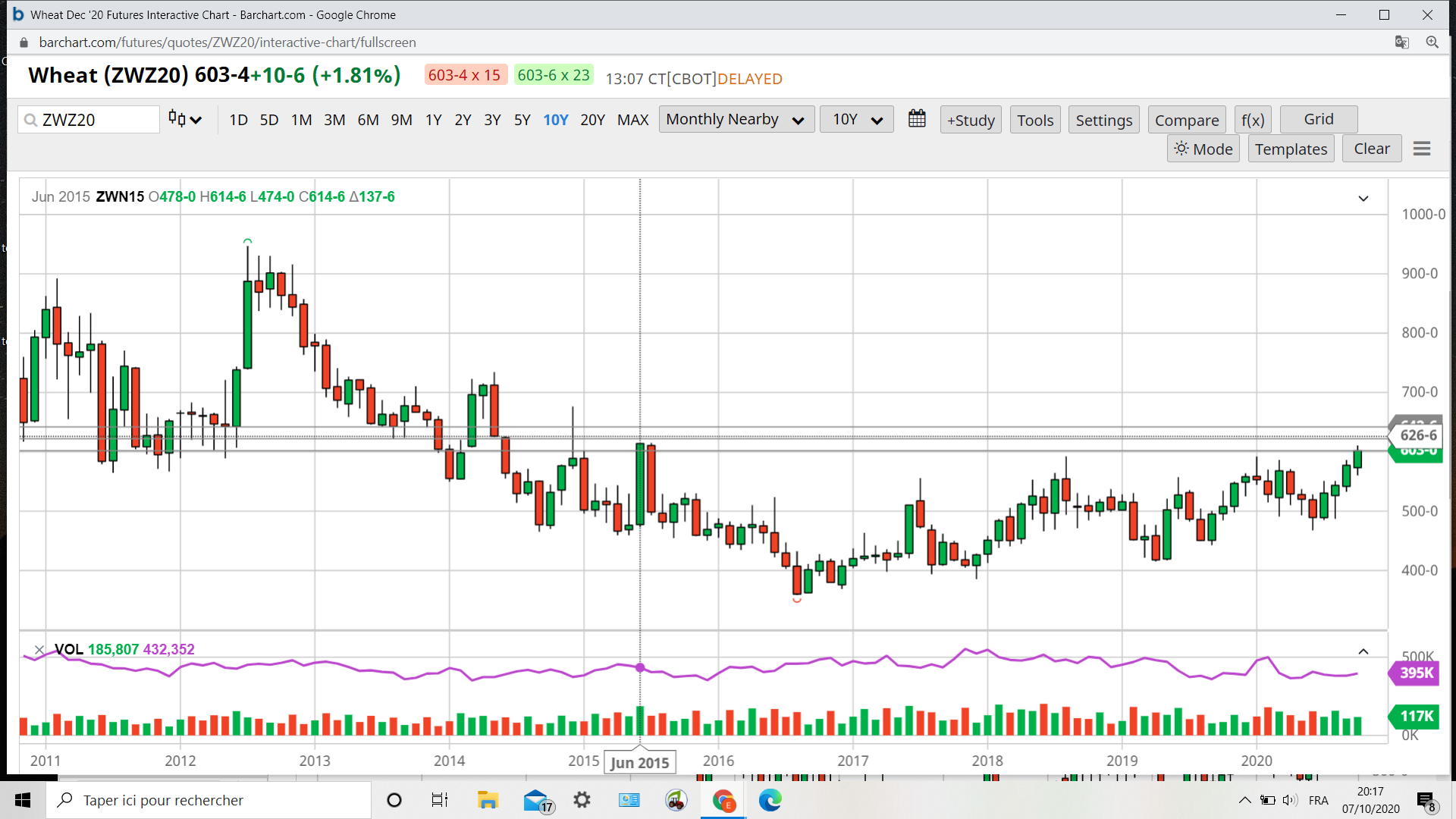 Il faut remonter à juillet 2015 pour retrouver les 620 du wheat.il m’a fallu rechercher le graphe des dix ans .