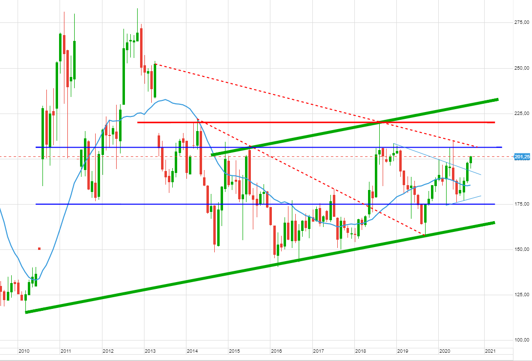 Un début de franchissement en cours depuis qu’on s’accroche à 195, c’est le seuil à ne plus retraverser à la baisse dans les prochains jours. Validation sur les bougies hebdo.