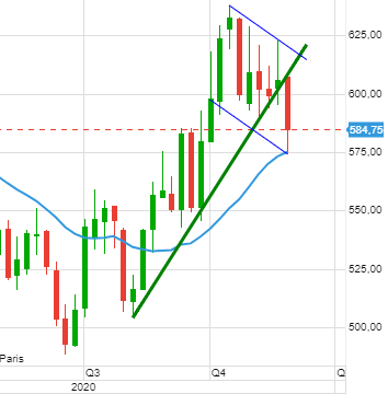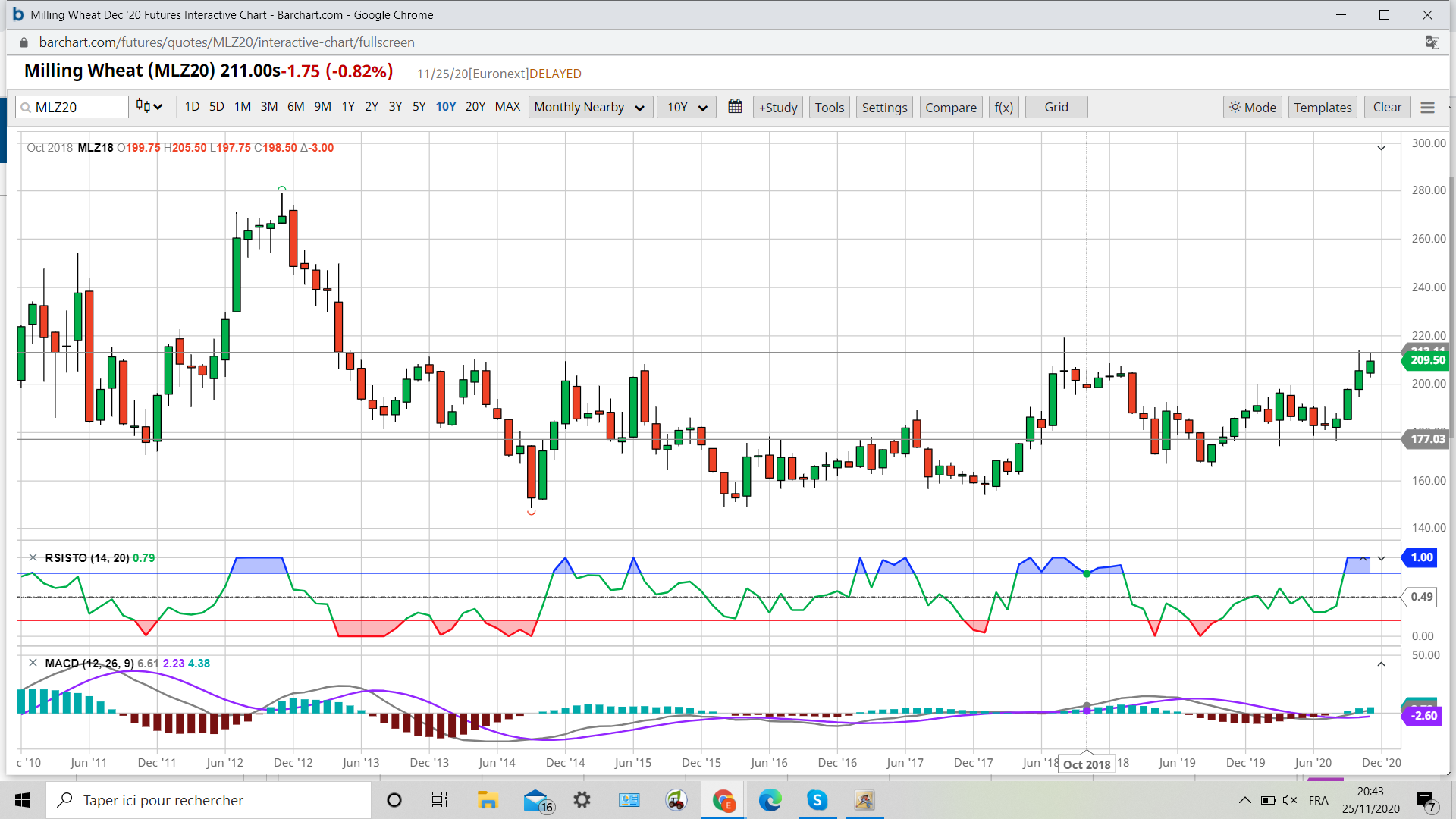 Et de viser reprendre à l’achat dans cette baisse, stop sous 198-200. Pour jouer un probable rebond, valide tant que wheat > 550. Et de préférence > MM20 hebdo.