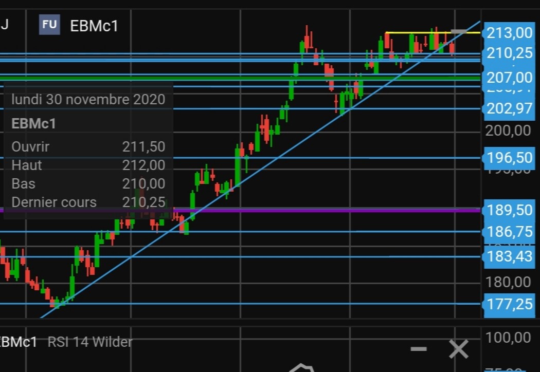 D’où ventes sur Mars au-dessus de 210. Rachats en vue. Possibles entrées Déc si ça tient aujourd’hui 1er/12 sur 210. Car sous 210… ça glisse.