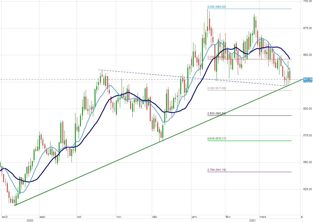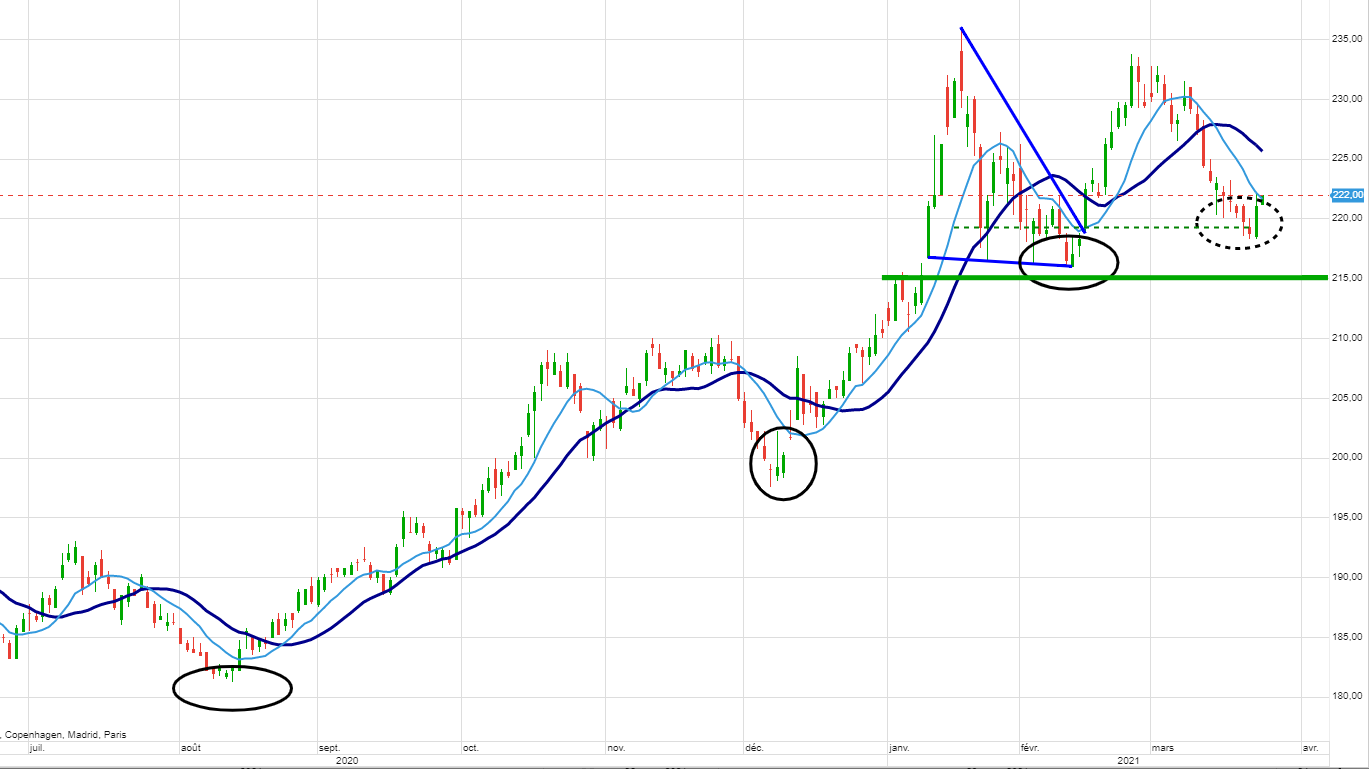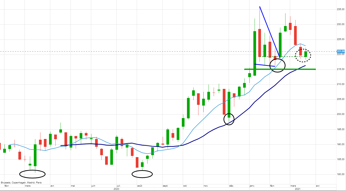 Toujours la zone 215-220 en surveillance support hebdo / mensuel.