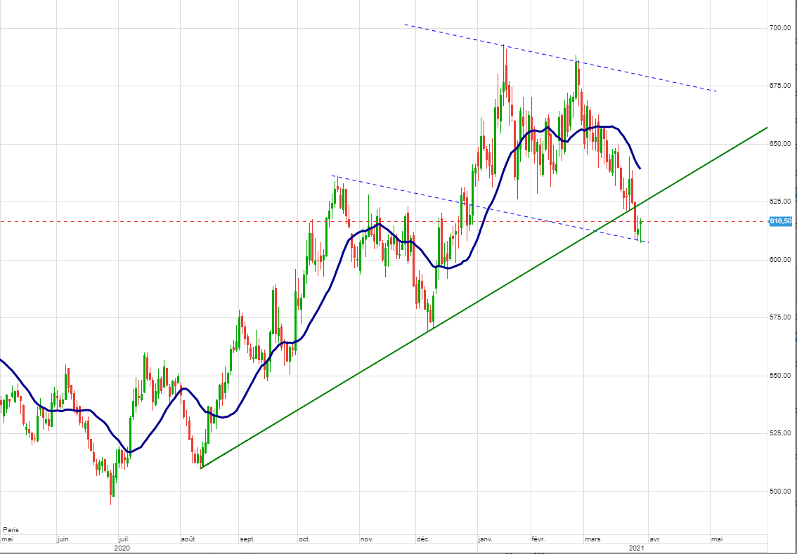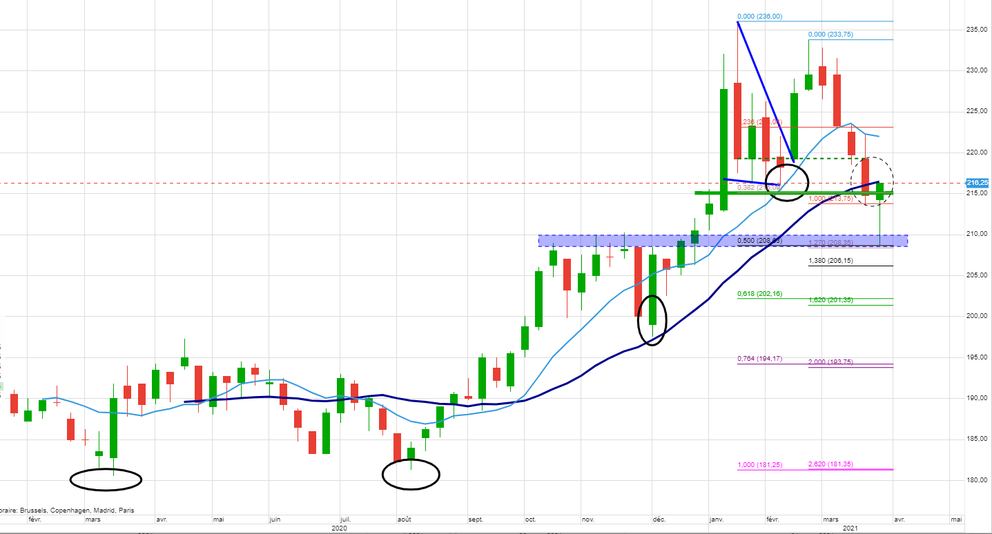 Nous sommes bien sur les 210 le rebonds serait le bienvenu. J’espère que la bougie de demain nous annoncera un retournement sur support.