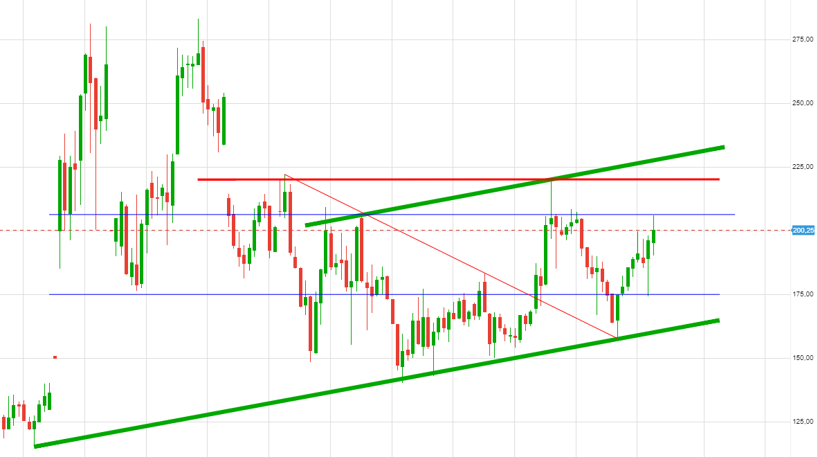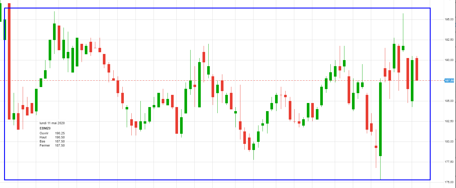 En attendant la sortie du cadre, les bas servent à acheter des calls ou futures, les hauts 190-195 sont des zones de couvertures possibles.