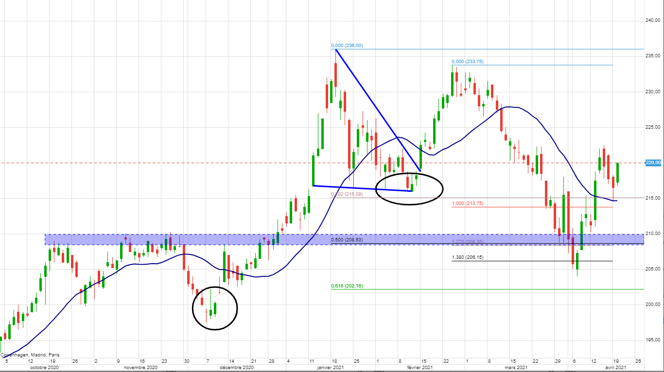 Oui mais si on n’est pas monté dans le train hier comme indiqué autour de 215, je n’achète plus aujourd’hui dans la poussée vers la résistance intermédiaire 225.