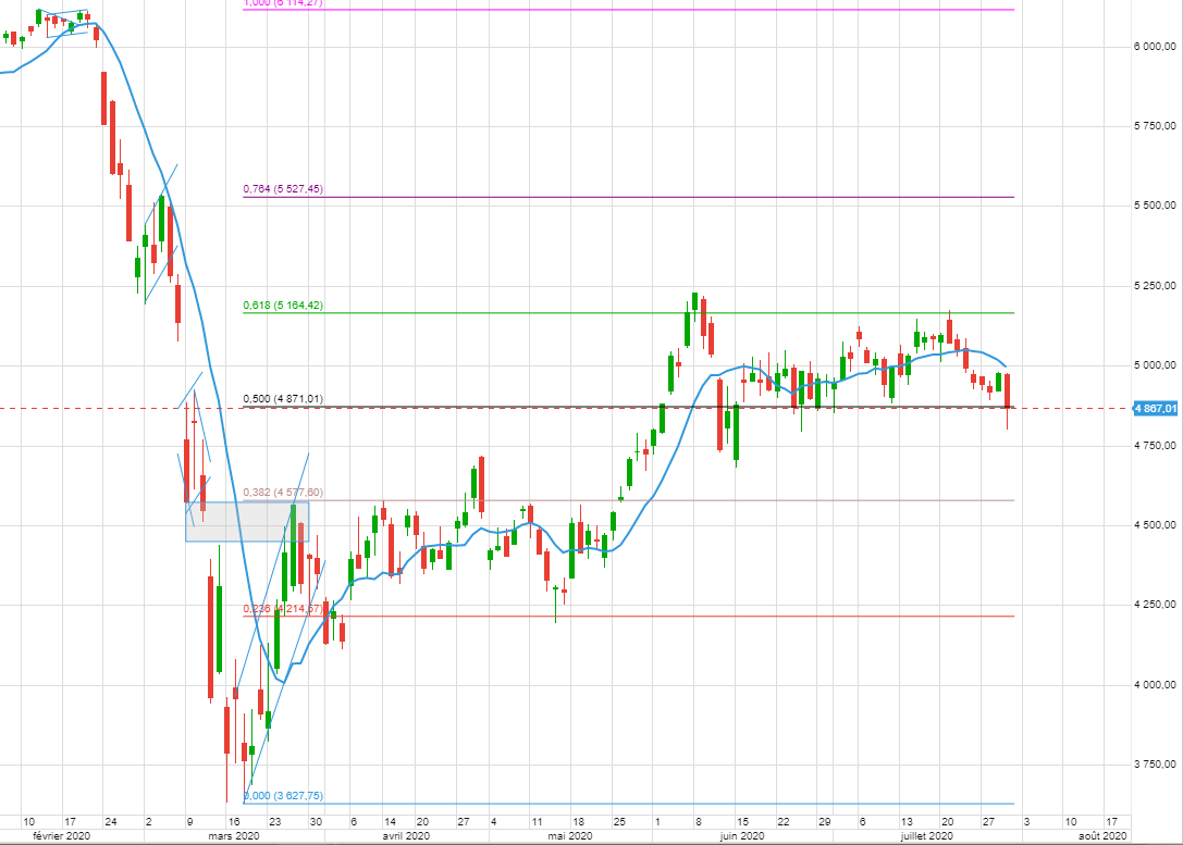 CAC/Crude oil ça plafonne;avec une rentrée de sept qui s’annonce compliquée sur le plan éco;social et sanitaire on est pas à l’abris d’un deuxième plouf sur le mois d’aout;vigilence…