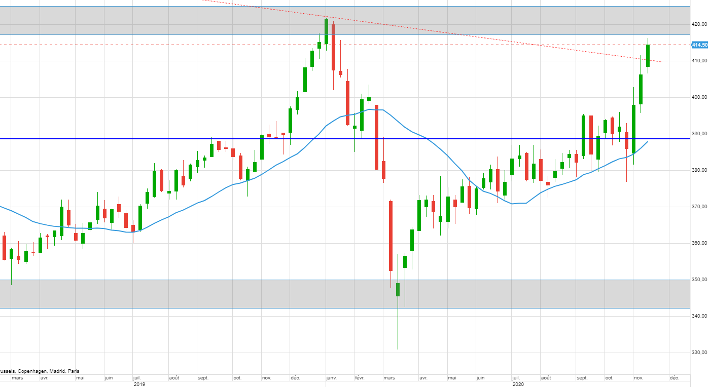 La semaine va se finir sur le blocage 410. Semaine prochaine importante. On a déjà atteint 411.50 cette semaine.