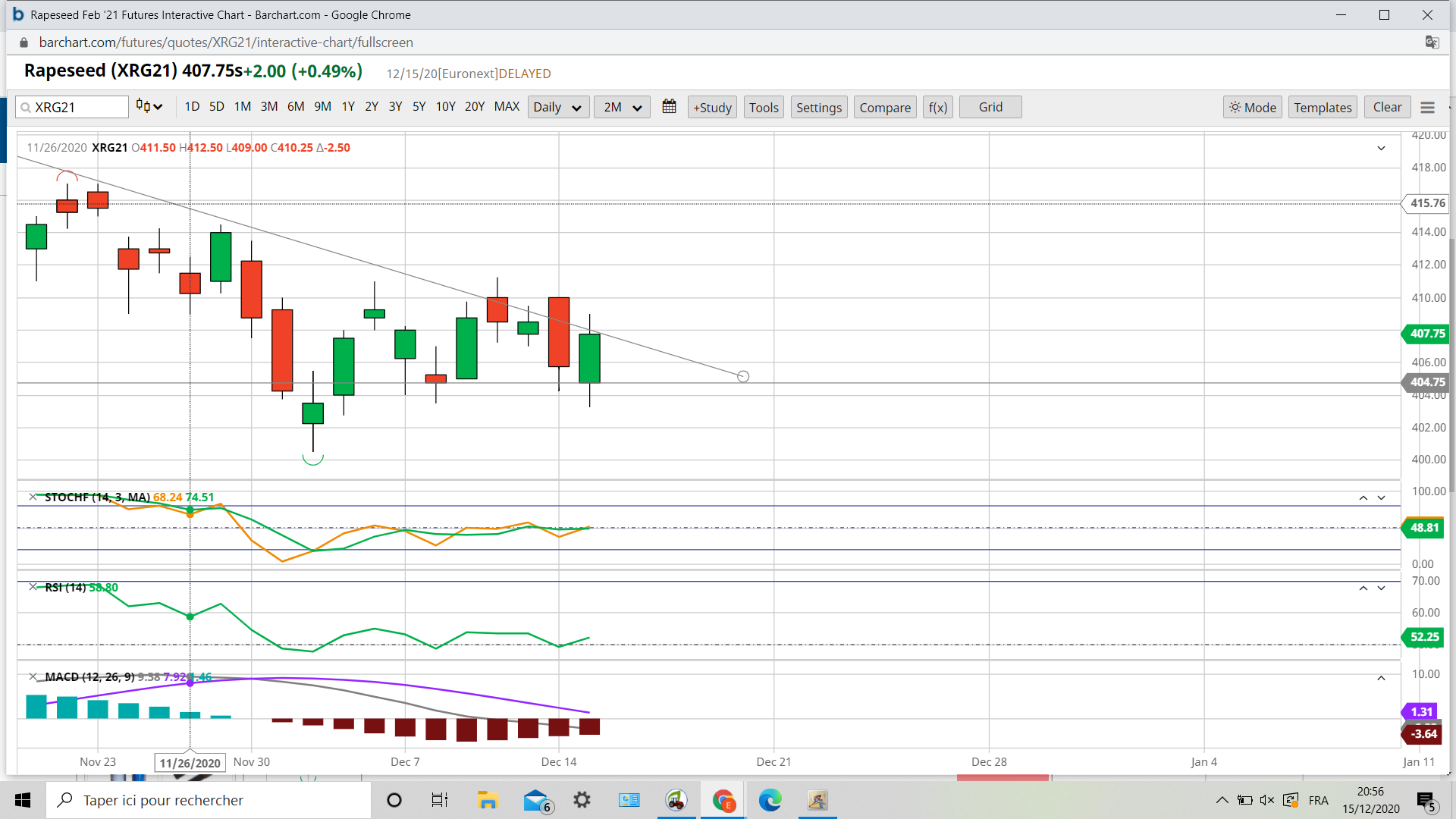 Le colza nous fait une phase d’attente entre 404 et 411, le temps que le soja termine son test intermédiaire autour de 1150.