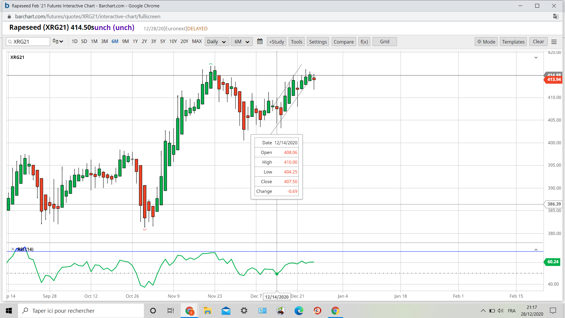 1ère séance 2021, le colza devrait avancer d’un cran dans la zone 420 et pousser vers le 1er objectif indiqué au-dessus de 417 FEV.