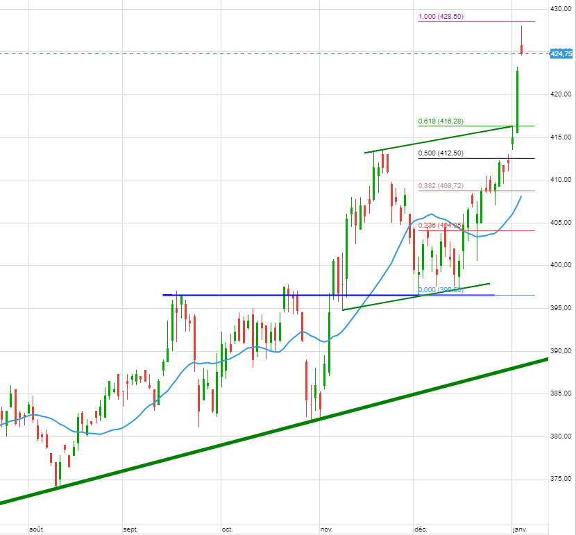 Sur la poussée en cours le stop c’est 417-418. Vue la progression rapide je le remonte pour assurer les gains. Sous 425. Mais je peux aussi décider de le monter à 430 si le total me convient.