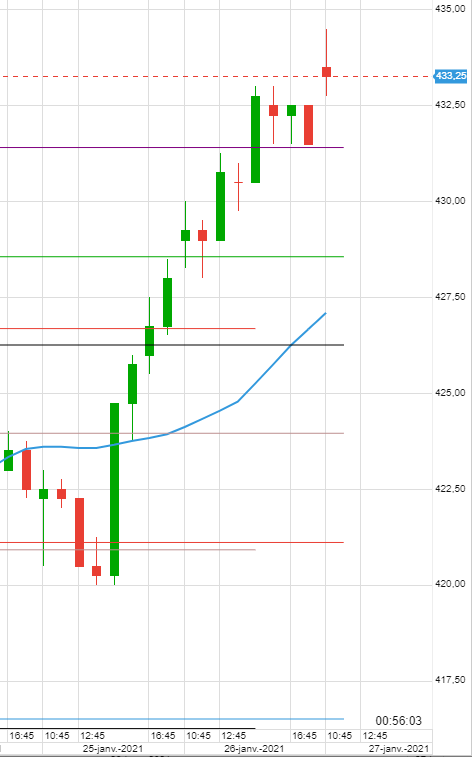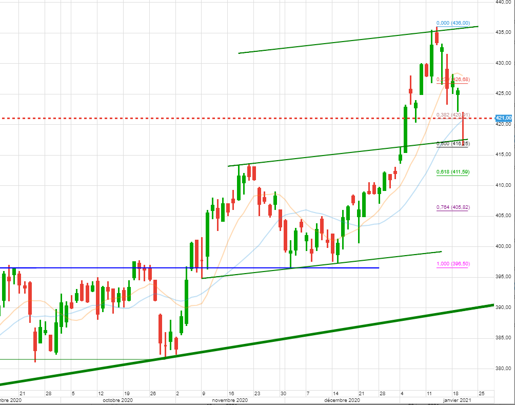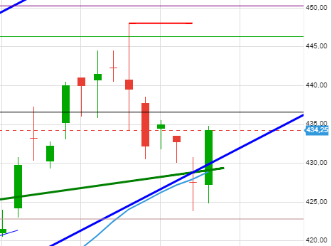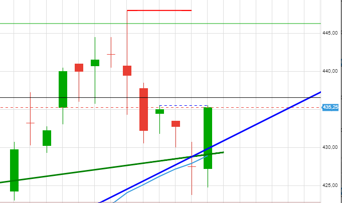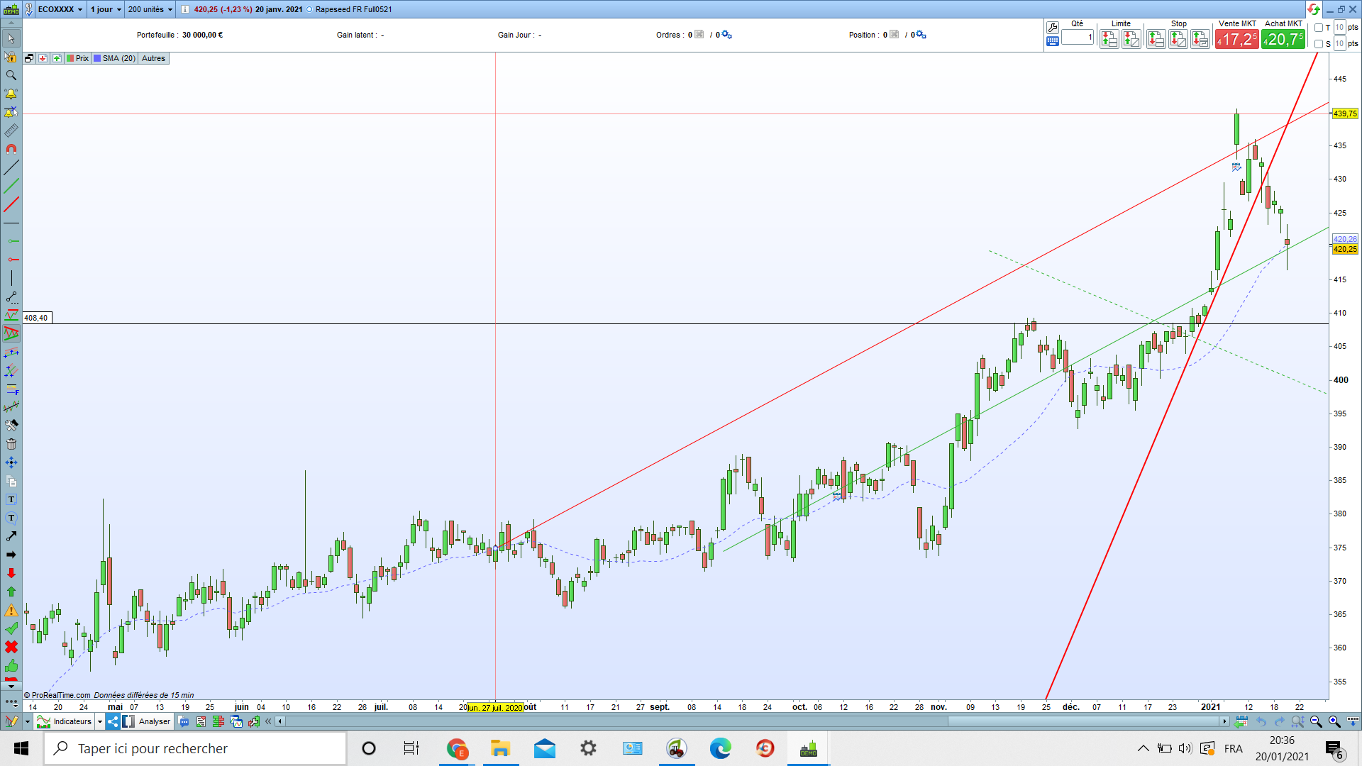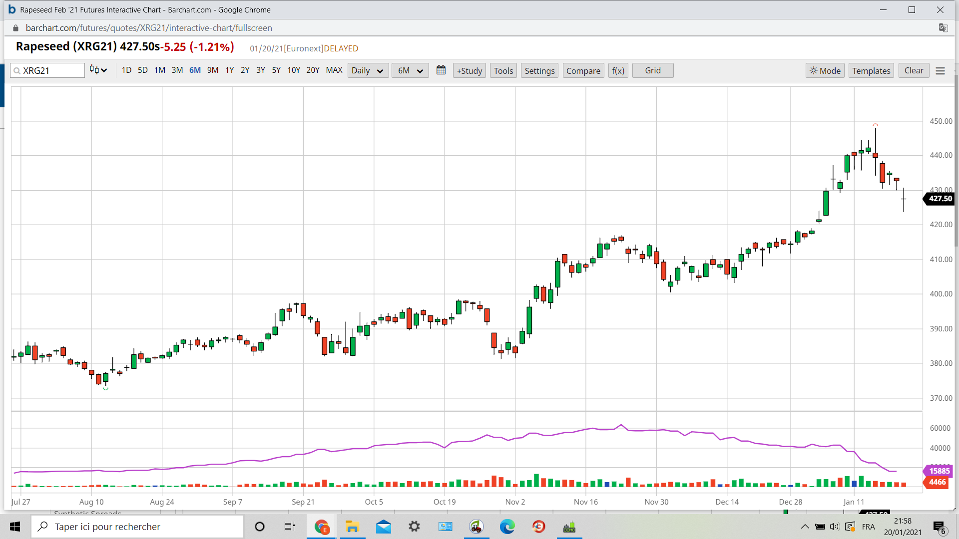 Mon cadrage indique le bas du range si le cadre est bon relance demain .Apres avoir couvert ma moisson céréales 21 les appels de marges ont eu raison de mes lots colza acheté 428 revendu 430 .Vendu 430 mai et racheté 428 avec la crainte du rebond .Dommage mon objectif 420 est bien arrivé.