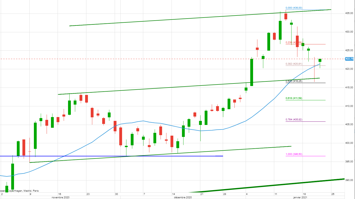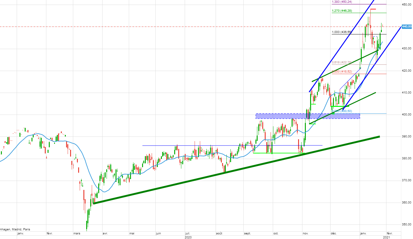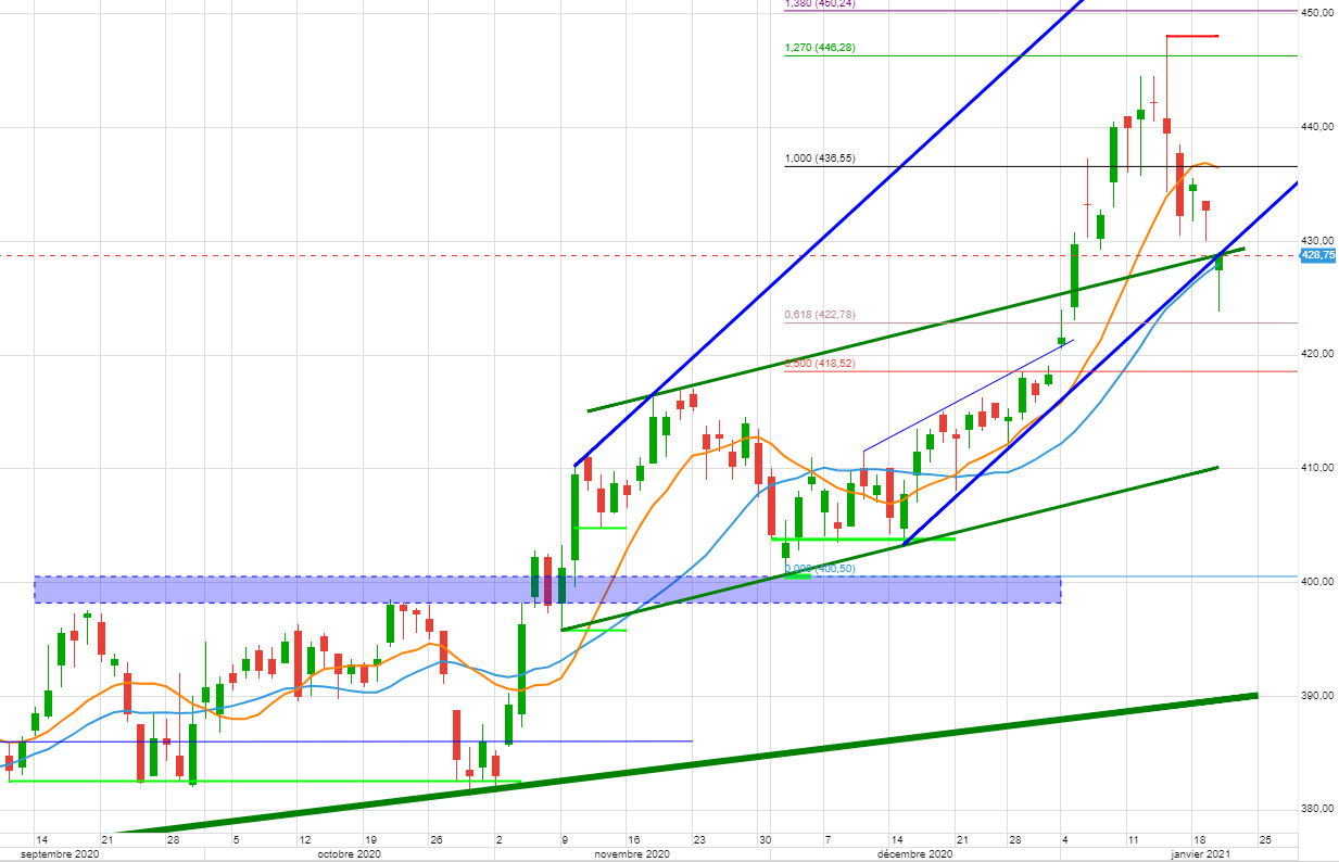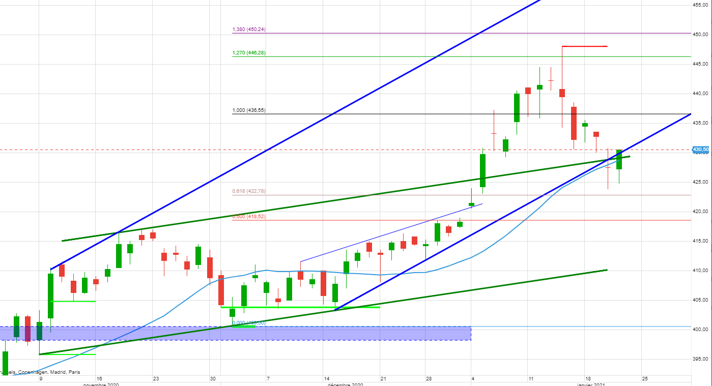 Les 1ers seuils à reprendre pour sécuriser ce rebond sont 1350(60) / 430.