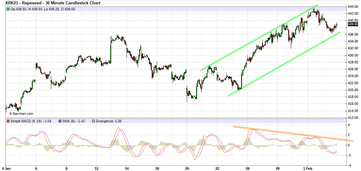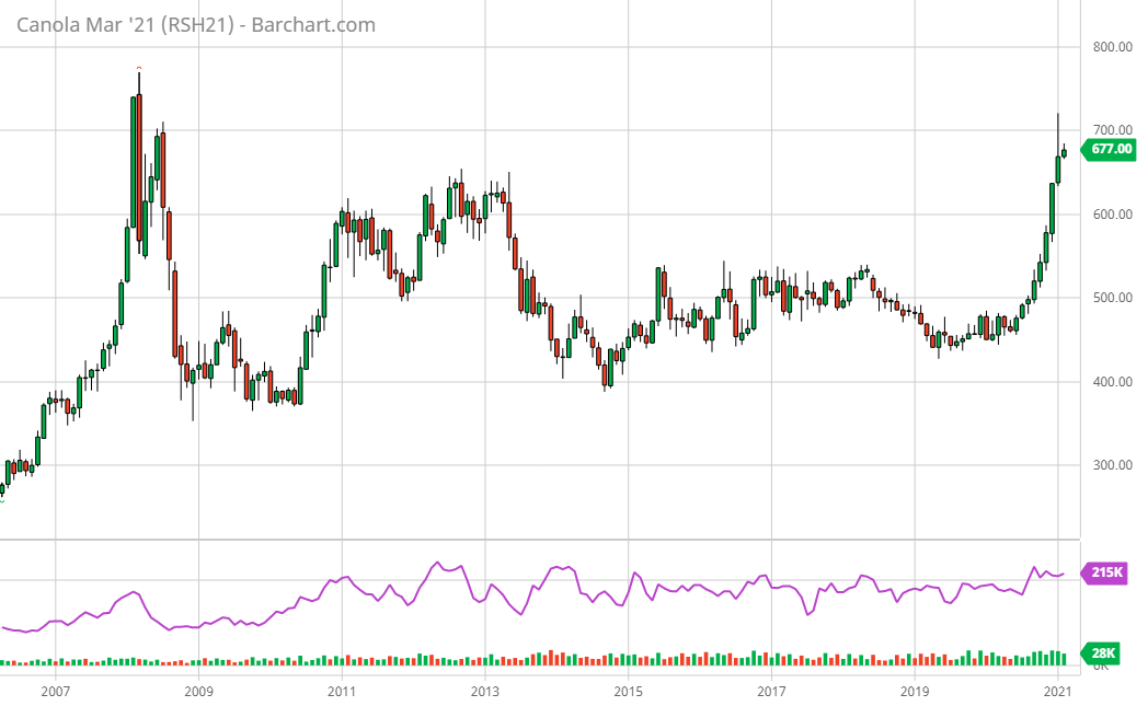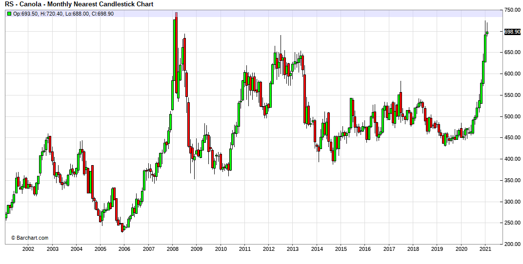 Le graphique de canola posté c’est du Barchart mensuel continu et la dernière bougie ils sont déjà sur l’échéance mai 21.