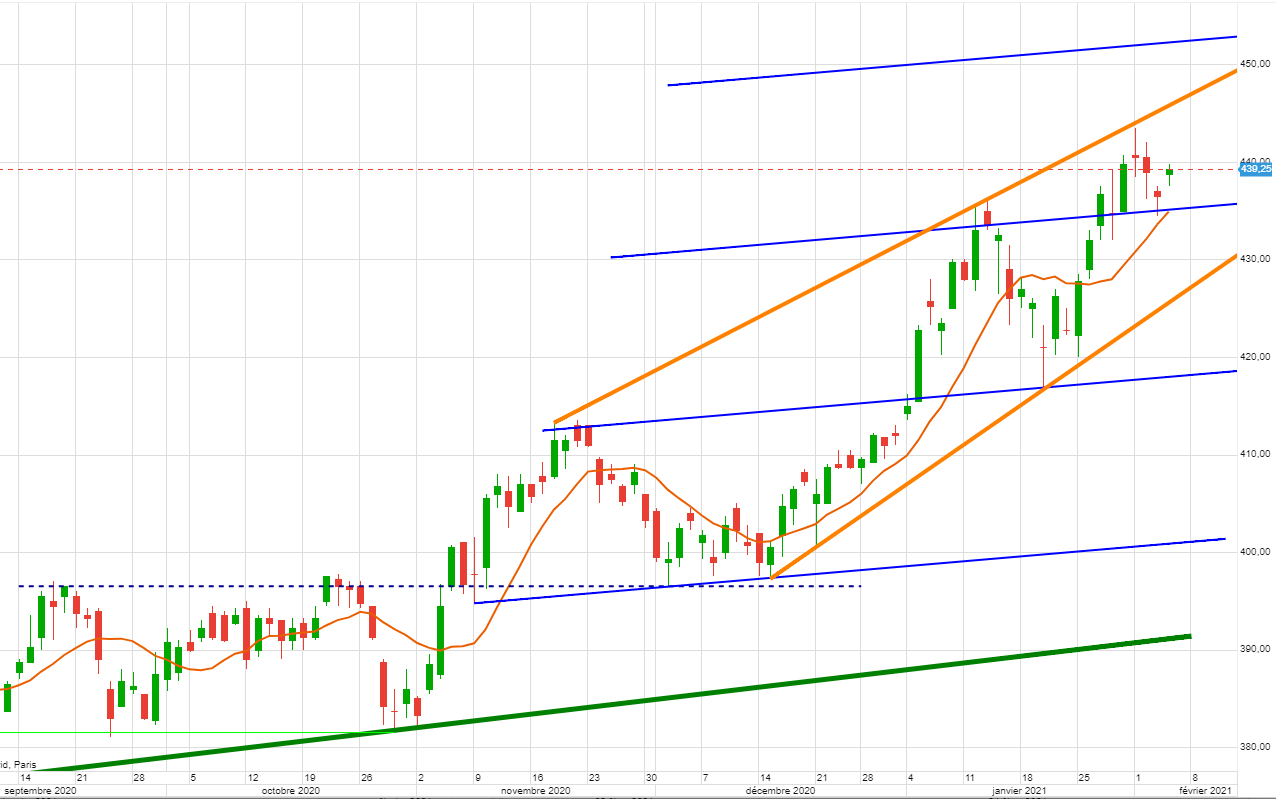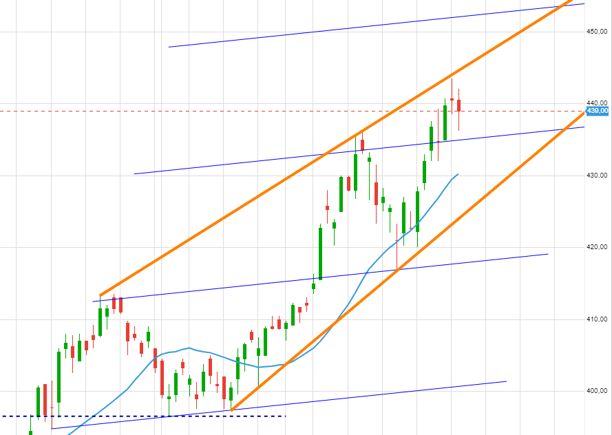 Les vendeurs continuent d’être assez nombreux à partir de 440, je les surveille tant qu’ils n’ont pas disparu. La consolidation demeure sous 440.