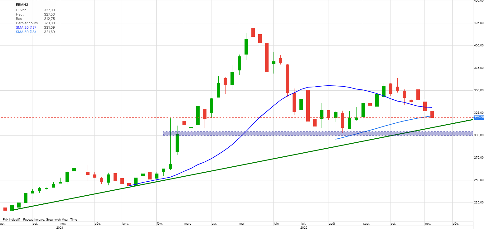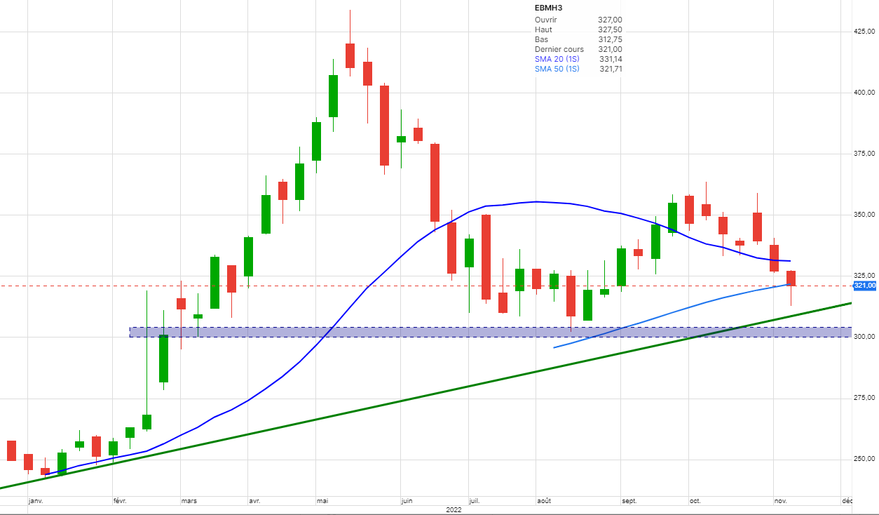 Bonne réaction au fil de la semaine, après un creux à 314.75 les cours ont pu remonter en fin de semaine à 331.