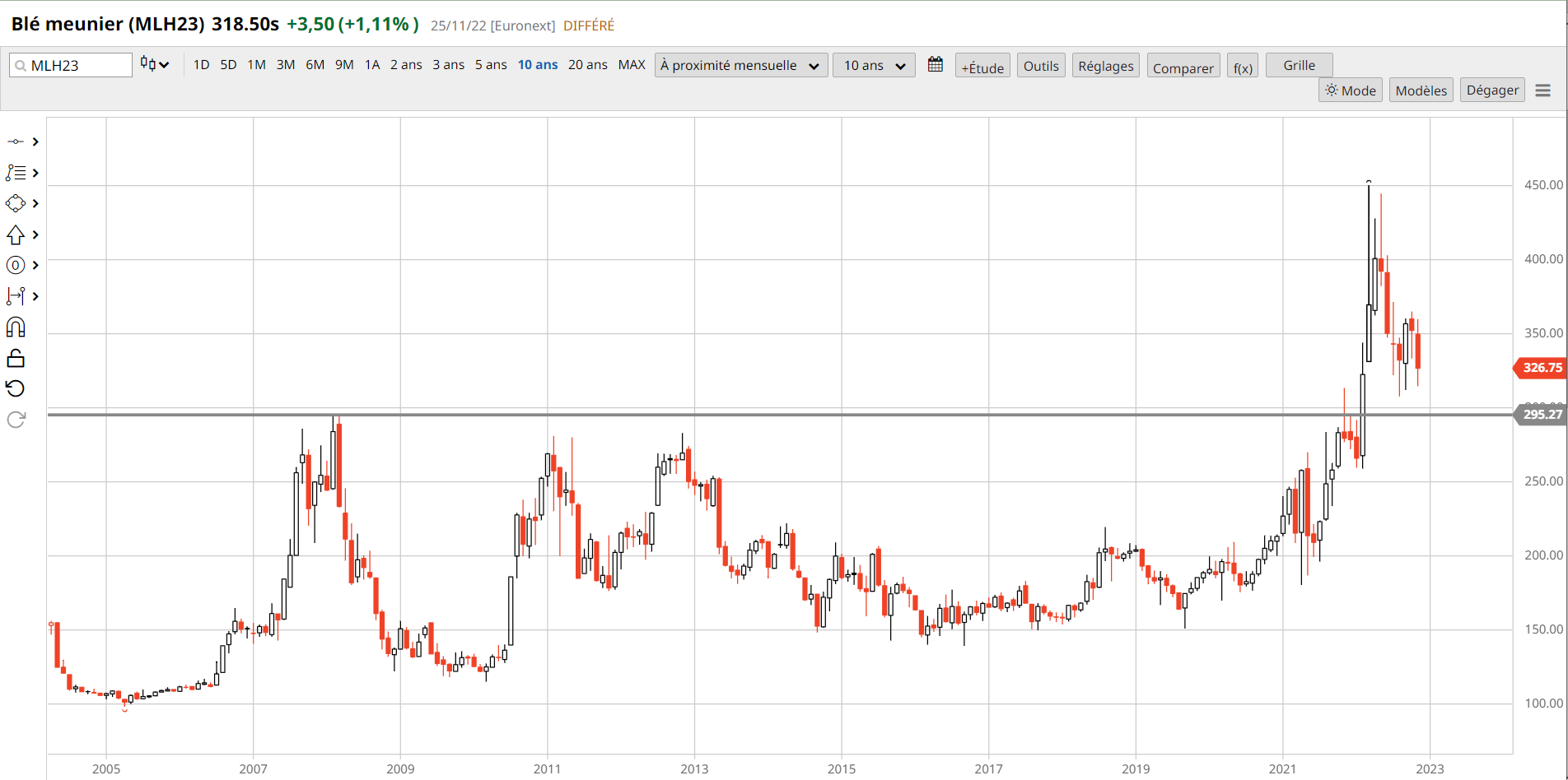 Le blé DEC revient sur 320.
