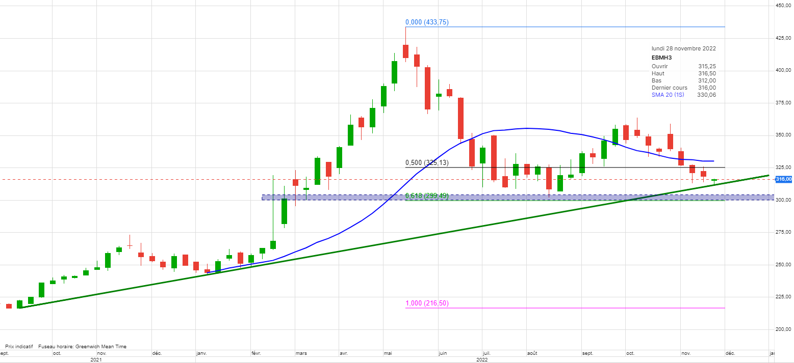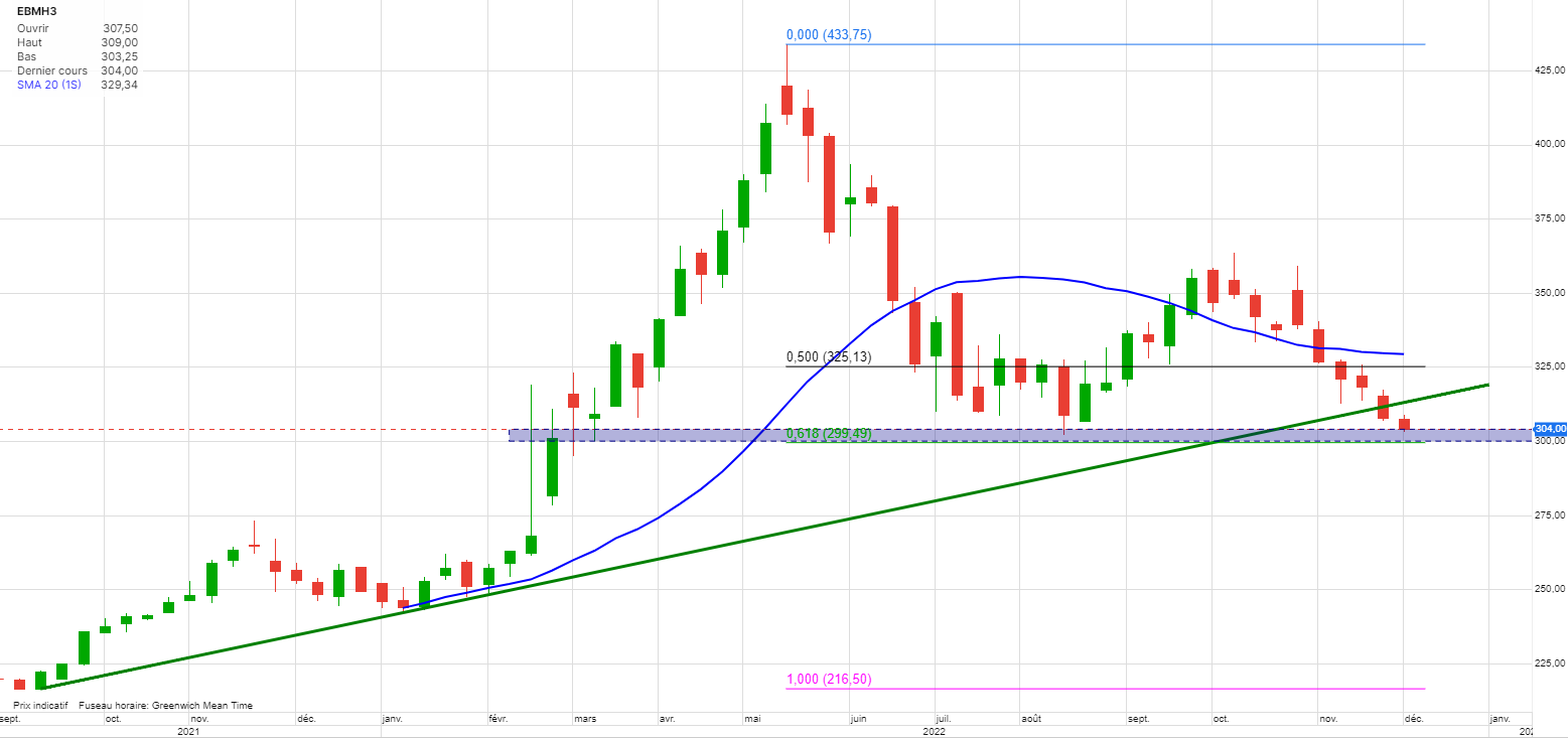 Le blé continue son très gros test du support 300. Ce qui le confirme bien comme un niveau majeur.