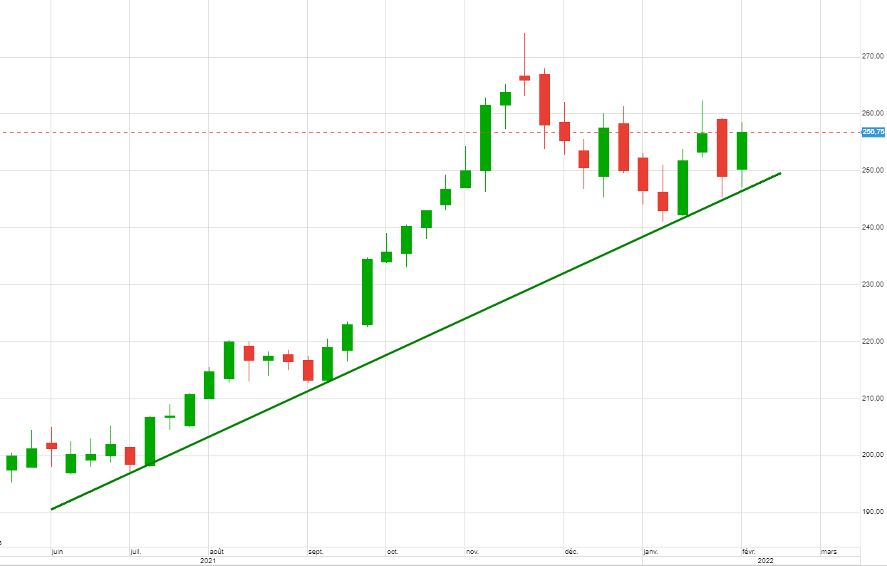 Perso j’ai racheté des lots septembre 21 à moins de 250 euros en moyenne ,je n’ai pas trouvé de calls à 10 euros ou strike 280 donc je suis parti avec des lots que je vais revendre sur un point haut pour racheter des calls décembre voila ma stratégie. Les calls sur l’oblique baissière bien sur, tout dans la méthode.