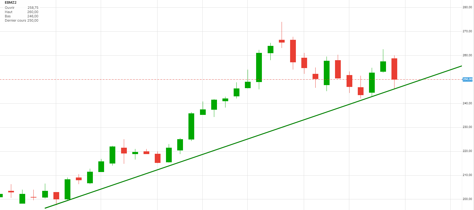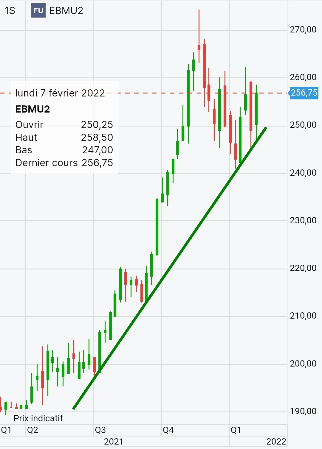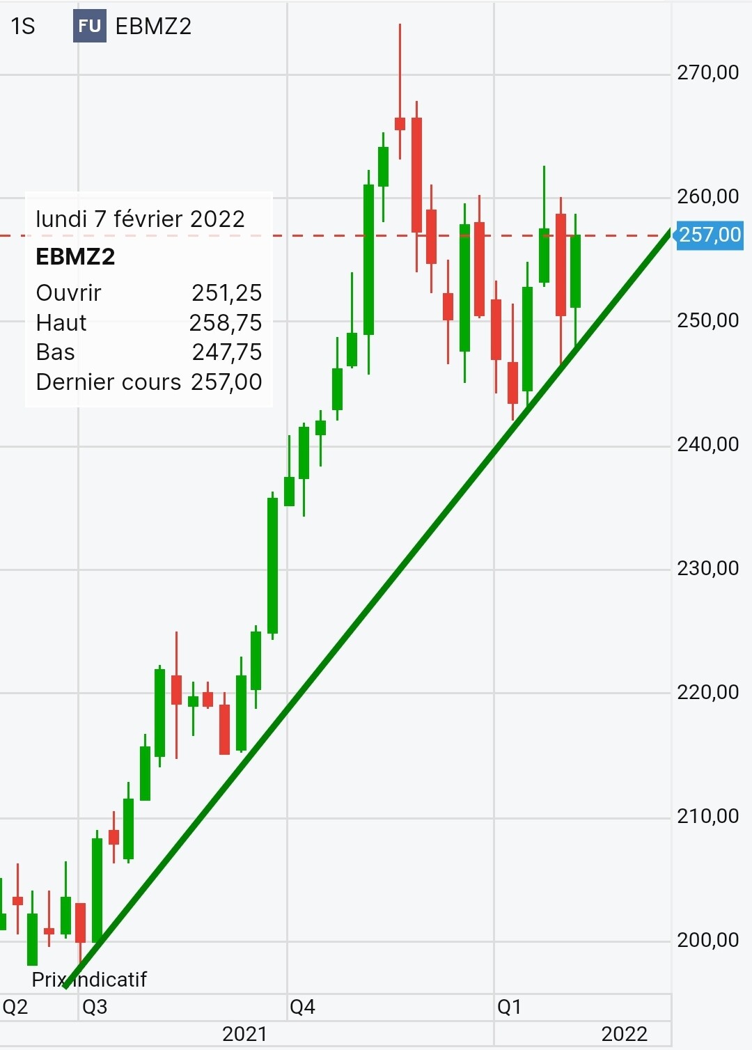 Oui j’y pense aussi un budget d’une dizaine d’euro mais pour l’instant un strike 280 .J’ai vendu du blé physique suite à mes achats d’engrais en juin je cherche a reprendre des calls sur 240 mais pas facile .Le 22 moins volatile que le 21.