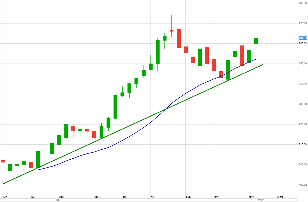 Il faut effectivement encaisser une partie, je vais vendre aussi des MAI repris sur support mais on vient de sortir du drapeau 280 alors je fais durer le plaisir. Je surveille l’installation au-dessus de 280.