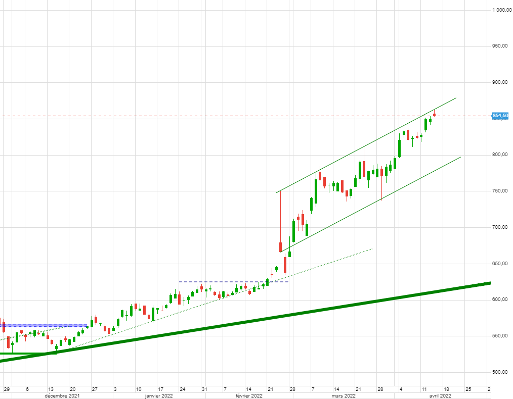Pour la suite du mouvement haussier impulsif il faudra sortir par le haut du canal haussier en cours + percer la zone 900. Pour objectif 1000.