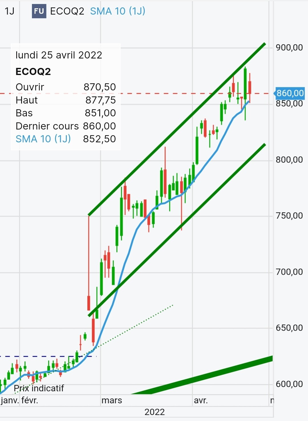 Le repère principal c’est toujours 1000, puis 900 seuil marqué à franchir, et en-dessous, eh bien on avance progressivement, avec un canal intermédiaire dont on teste à nouveau le haut.