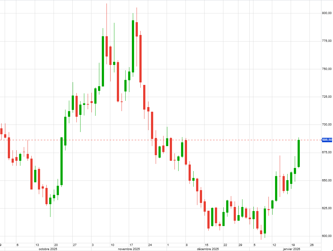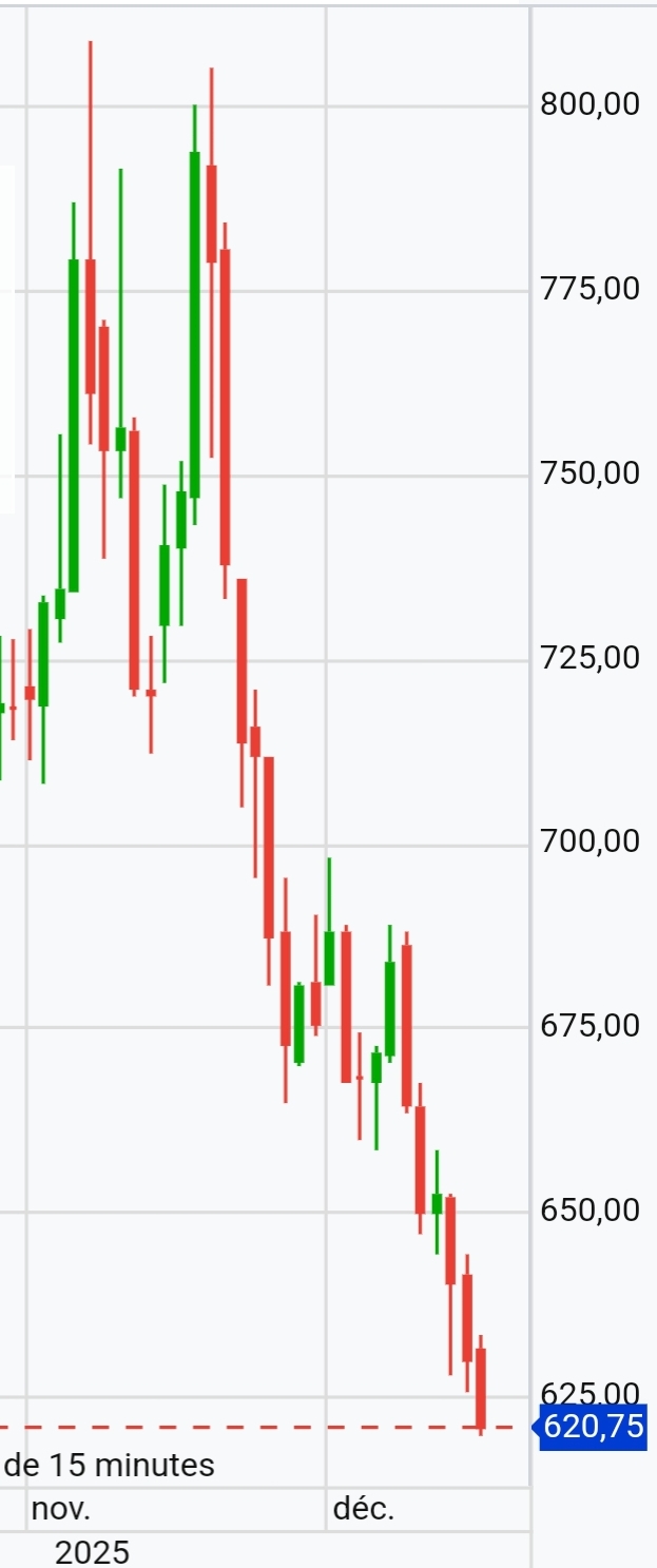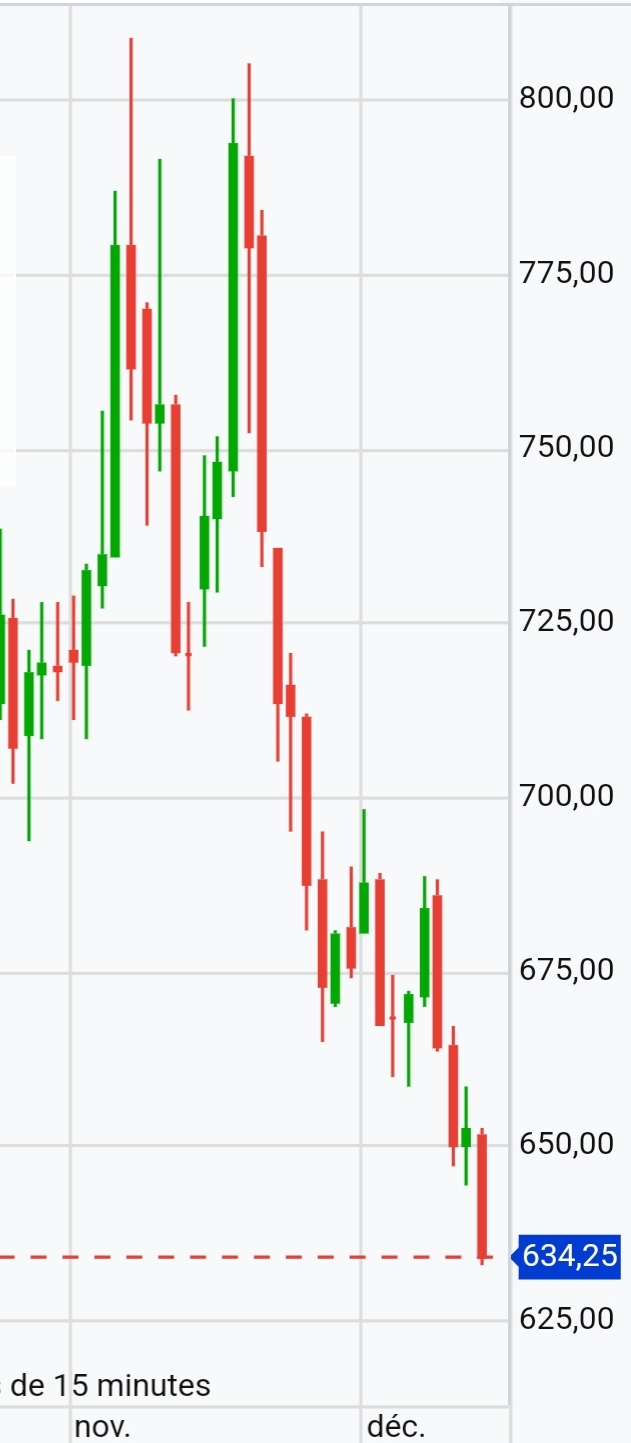 Poussée jusque sous 700 mais ça ne tient pas plus, alors retour vers 650, en range temporaire. Une sortie par le bas permettrait de réaliser pleinement le M et serait un argument pour suivre des achats. On devrait être fixé prochainement.
