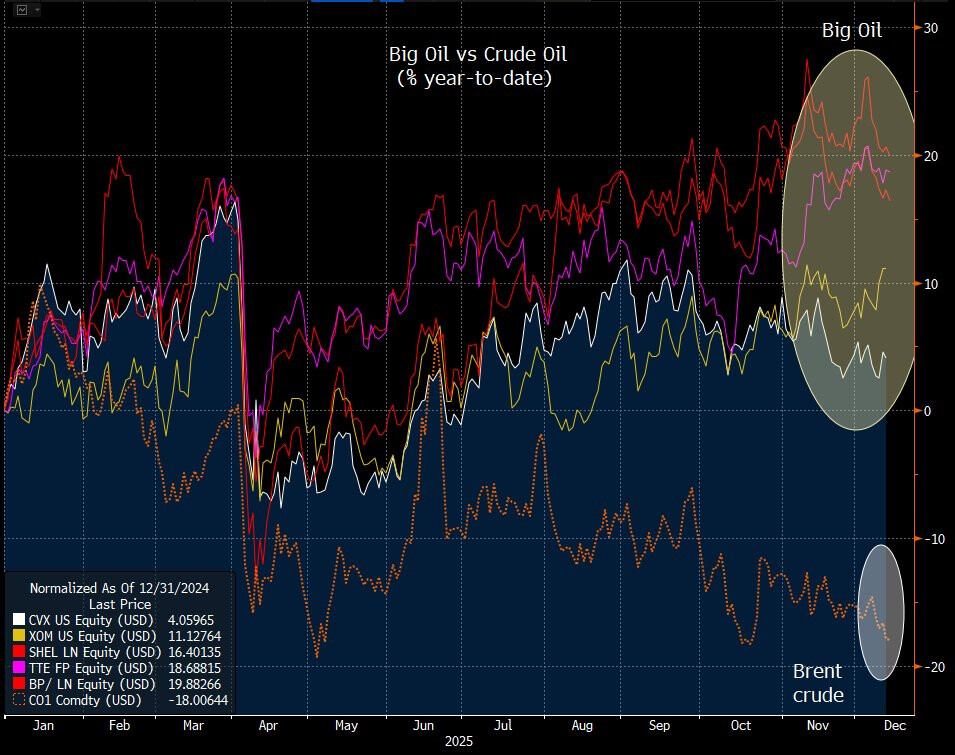 Sur an an Chevron, Exxon, Shell, Total Energie et B.P. ont progrésse de 5 à 20 % en valorisation boursière alors que le Brent a perdu 18 %